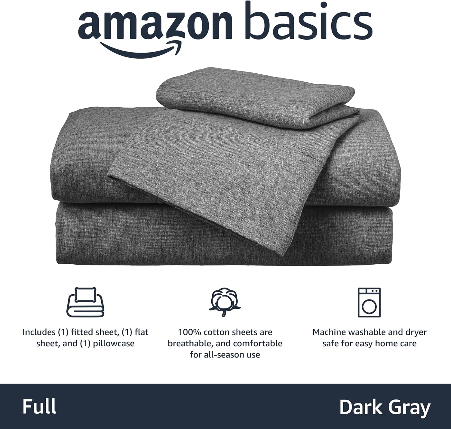 Amazon Basics 4 Piece Bed Sheet Set, 100% Cotton Jersey, Includes Super Soft, Flat and Fitted Sheets, Pillowcase, Full, Dark Gray, Solid