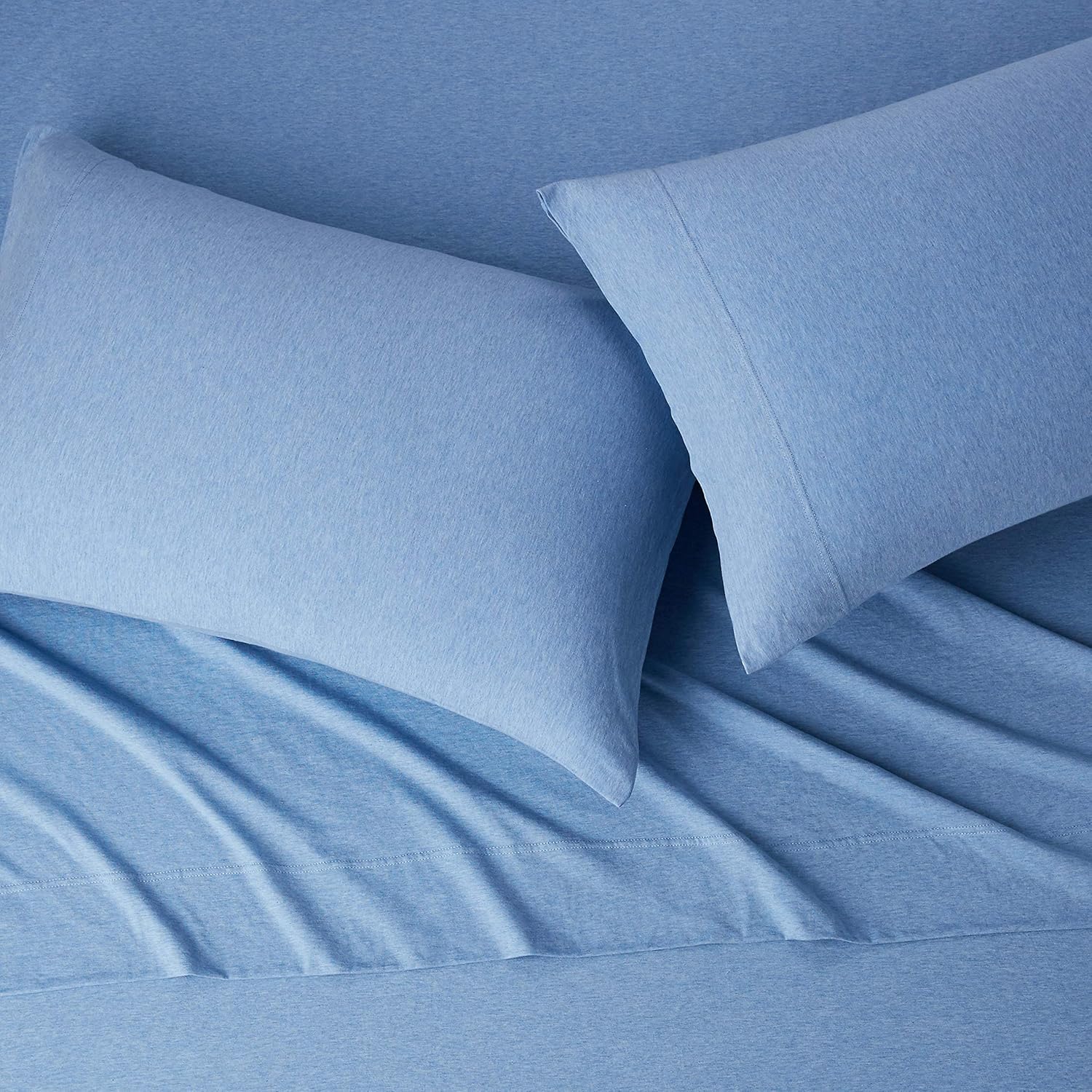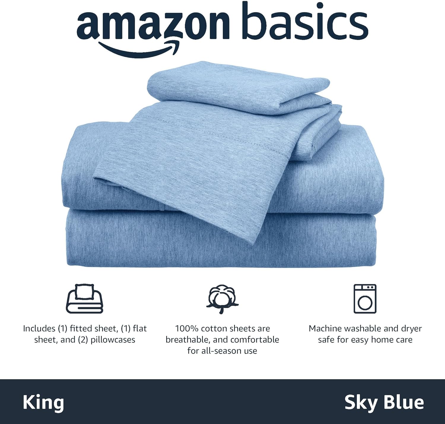 Amazon Basics 4 Piece Bed Sheets Set, 100% Cotton Jersey, Includes Super Soft, Flat and Fitted Sheets, Pillowcase, King, Sky Blue, Solid