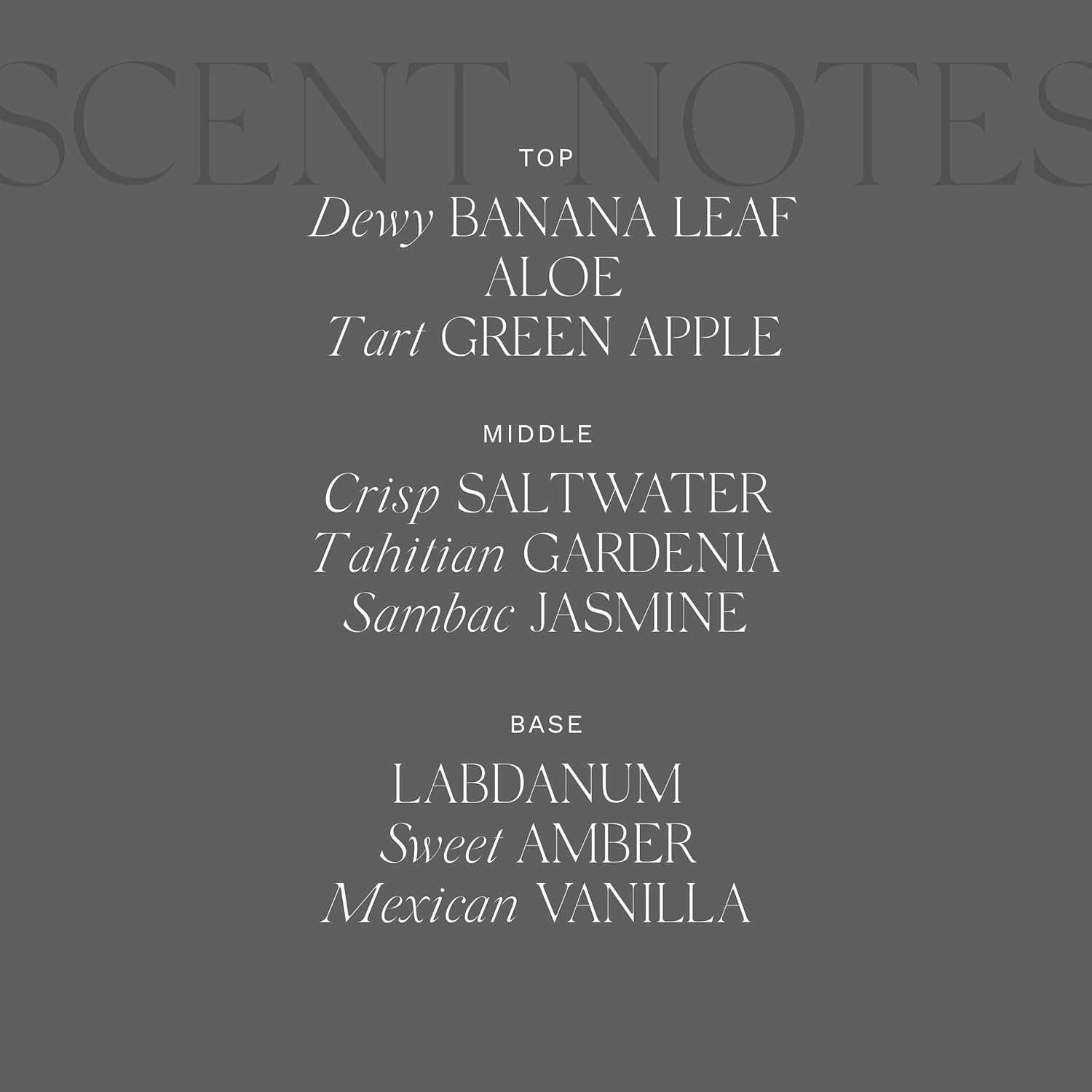 - Windswept Palms: An intriguing, lush green floral Tahitian fragrance reflective of the exquisite natural beauty that exists just beyond the sea