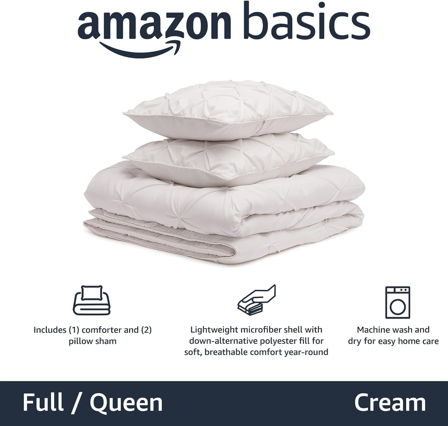 Amazon Basics Warm, Breathable Queen Size Comforter Sets, All-Season Down-Alternative 3-Piece Bedding Set, Pinch Pleat Design, Full/Queen Size, Cream
