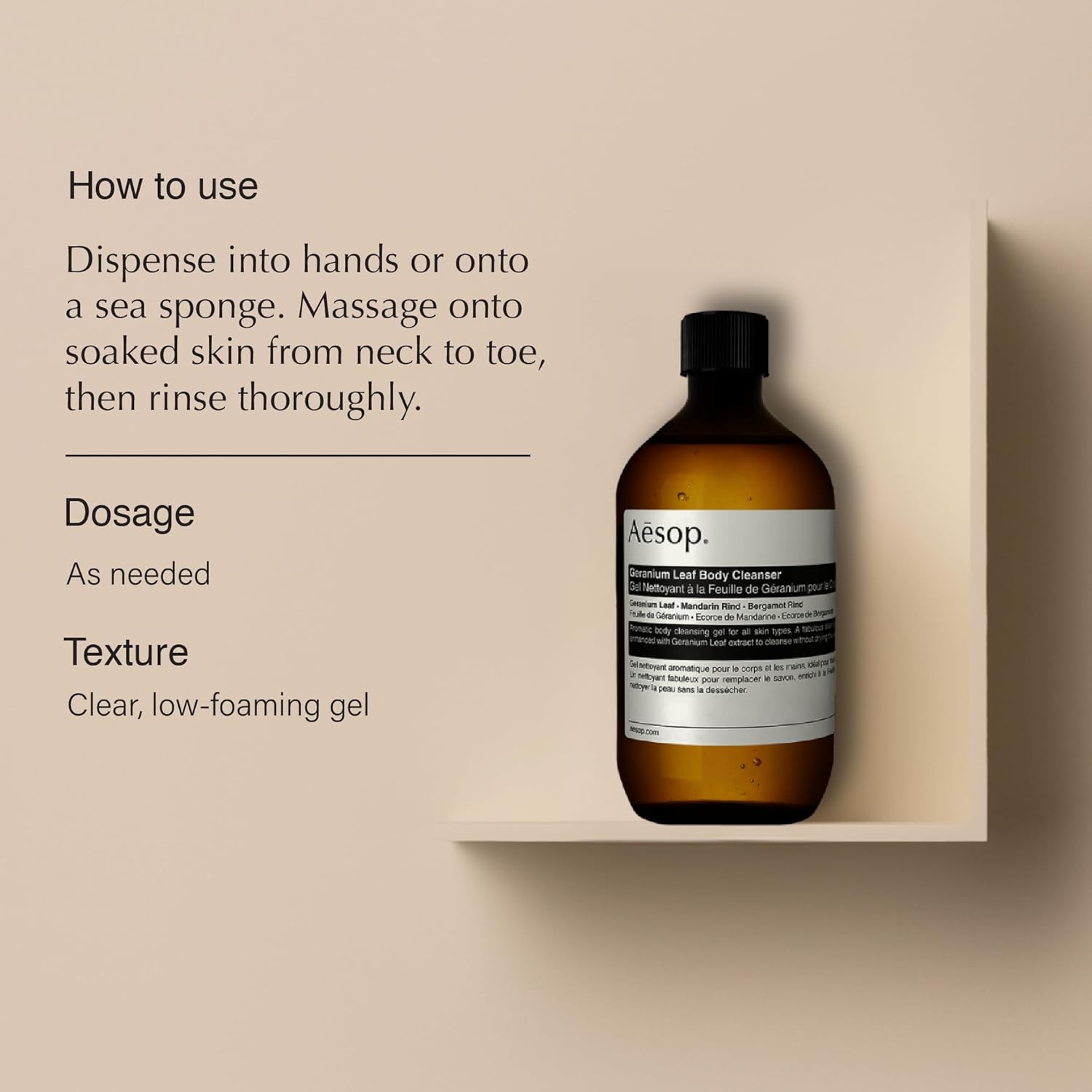 - How to use: Dispense into hands or onto a sea sponge. Massage onto soaked skin from neck to toe, then rinse thoroughly.