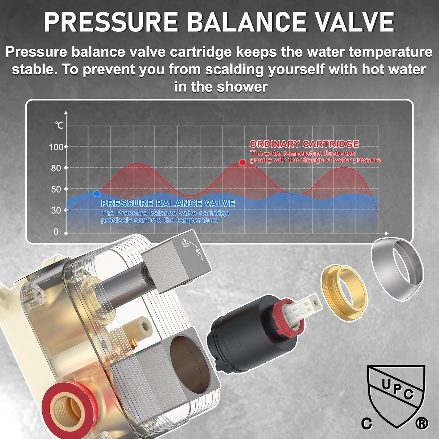 - Pressure balance valve: Pressure balance valve can avoid scalds by sudden change of water pressure, and protect your family member especially elder and children;
