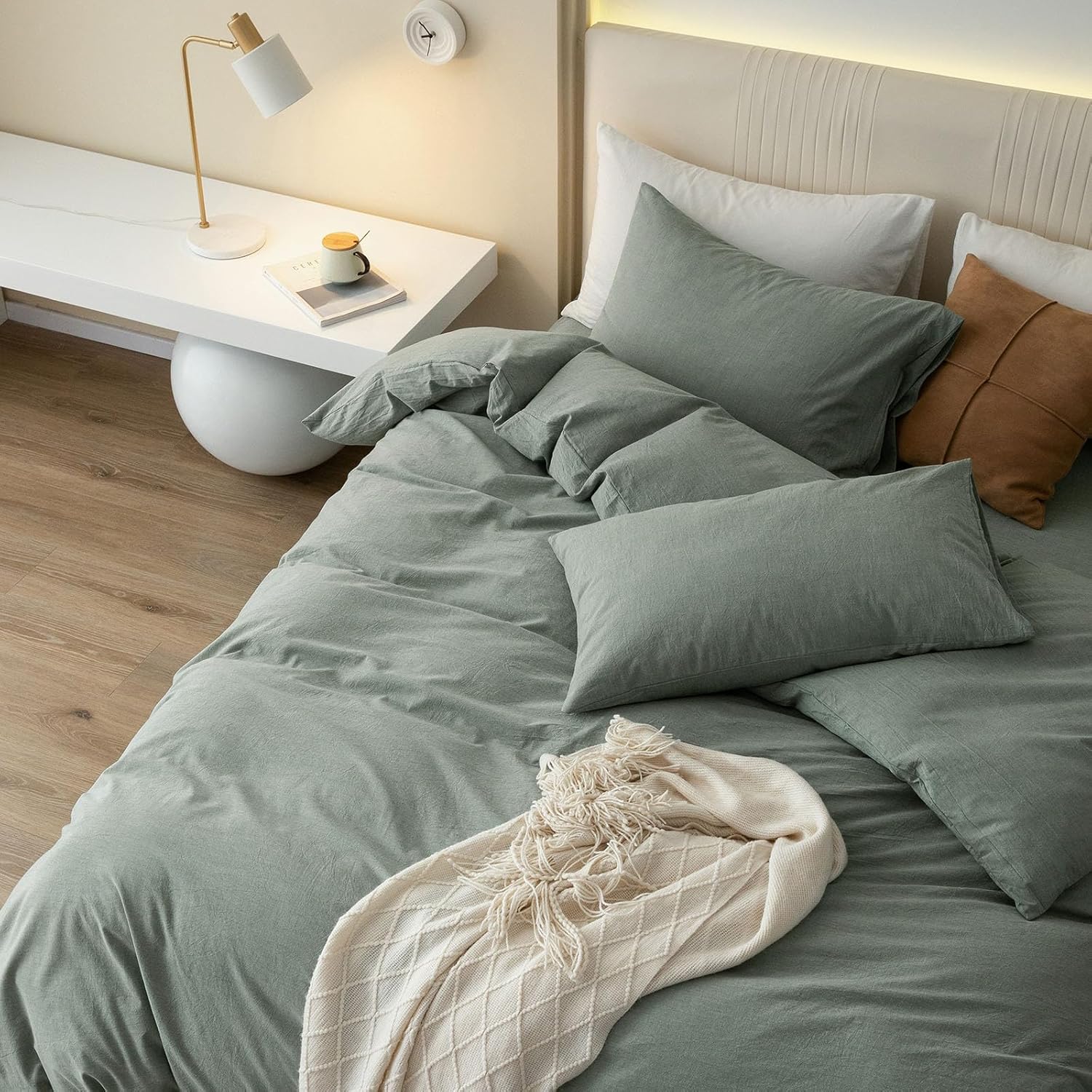 JIYUAN 100% Washed Cotton Duvet Cover Set 3 Pieces King, 1 Duvet Cover 104x90 Inches(Comforter Not Included) and 2 Pillowcases,Linen Feel Bedding Set Comfy and Breathable, Heathered Green