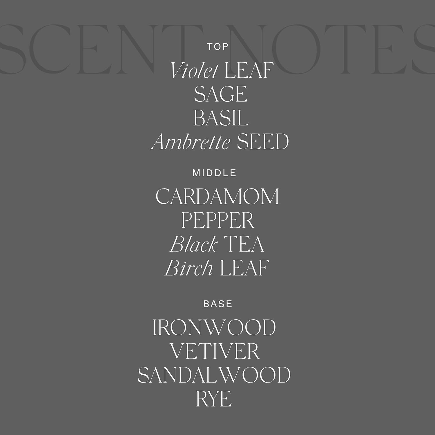 - Herbs, Woods & Spices: An herbaceous medley blends with aromatic cardamom, black pepper and black tea and an infusion of vetiver, birch and violet; notes of sandalwood, vanilla and rye lend balance