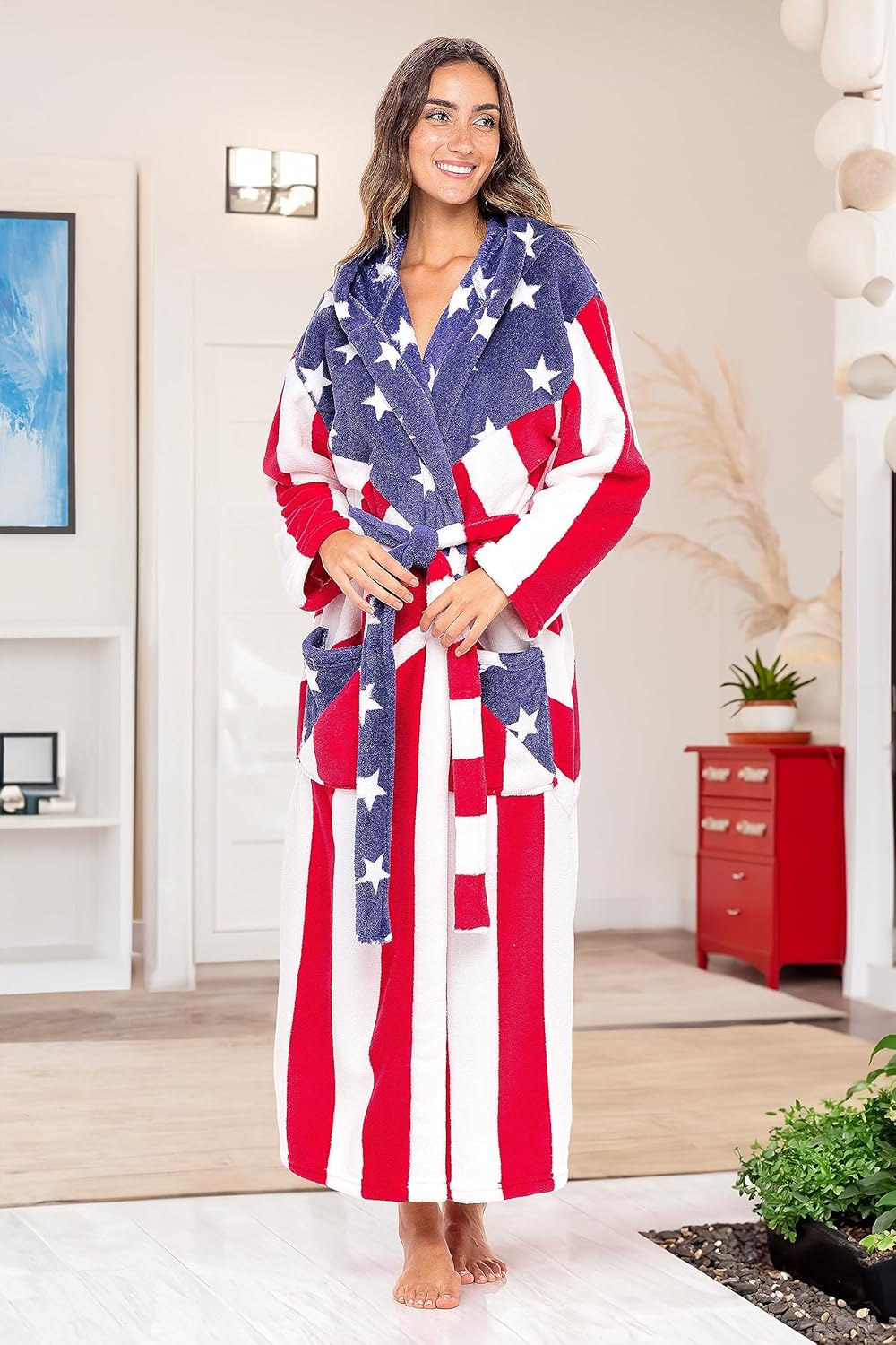- THICKER - 2 times thicker than average fleece robe for women bathrobe. Hooded Bath robes female with male versions also available. The ideal, stylish housecoats for women for Fall and Winter. Size medium, American Flag Classic robe by Alexander del Rossa.