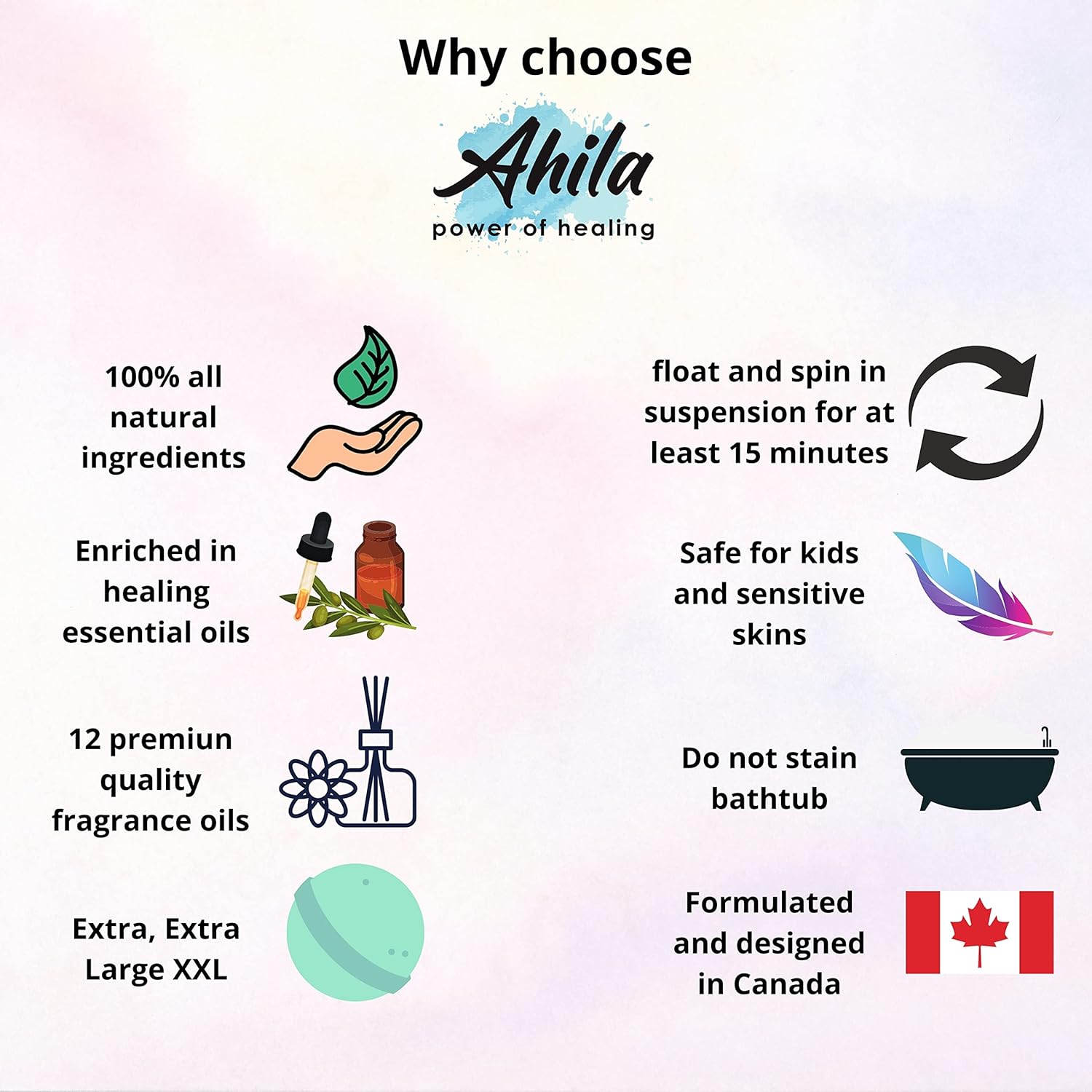 - Bunch of Goodness! Our Ahila power of healing handmade organic bathbombs are made with 100 percent all natural and safe ingredients for sensitive skin. Our Vegan bubble bombs are cruelty free, dairy free, and safe for kids! Our fizzy fun bath bombs are designed and formulated in Canada with unique designs, colors, and scents. Each bath ball is individually wrapped and packed for the best quality experience in a highly sterilized environment.