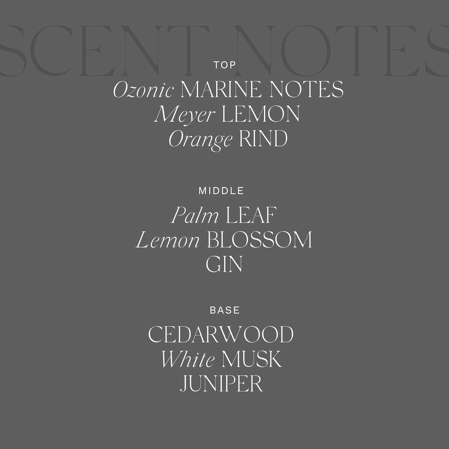 - The Ultimate Beach Excursion: Cool blue saltwater notes, infused with crisp Meyer lemon and orange rind, are warmed by bright rays of sun and glistening sand
