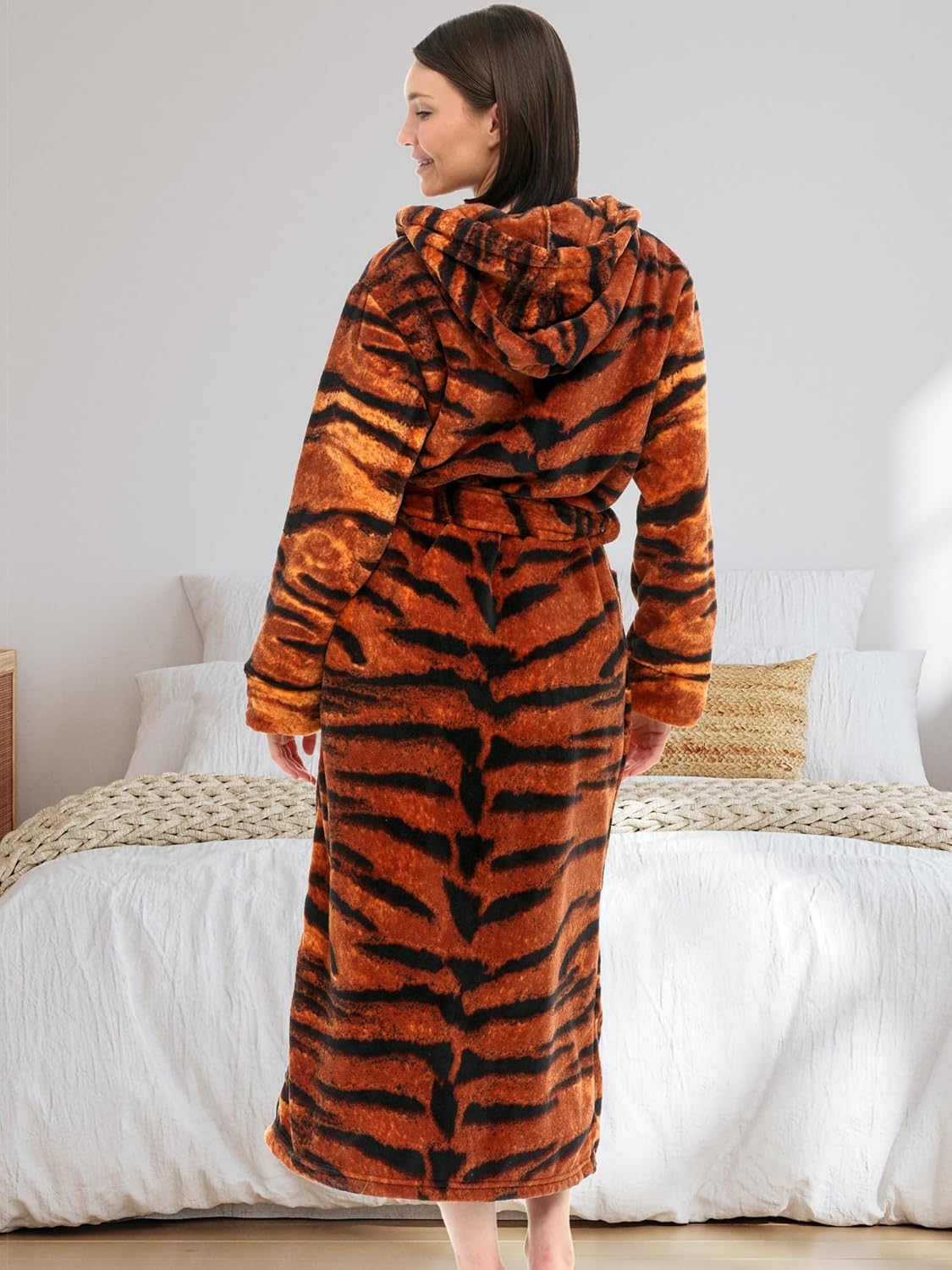 - THICKER - 2 times thicker than average fleece robe for women bathrobe. Hooded Bath robes female with male versions also available. The ideal, stylish housecoats for women for Fall and Winter. Plus size 2X, Bengal Tiger robe by Alexander del Rossa.