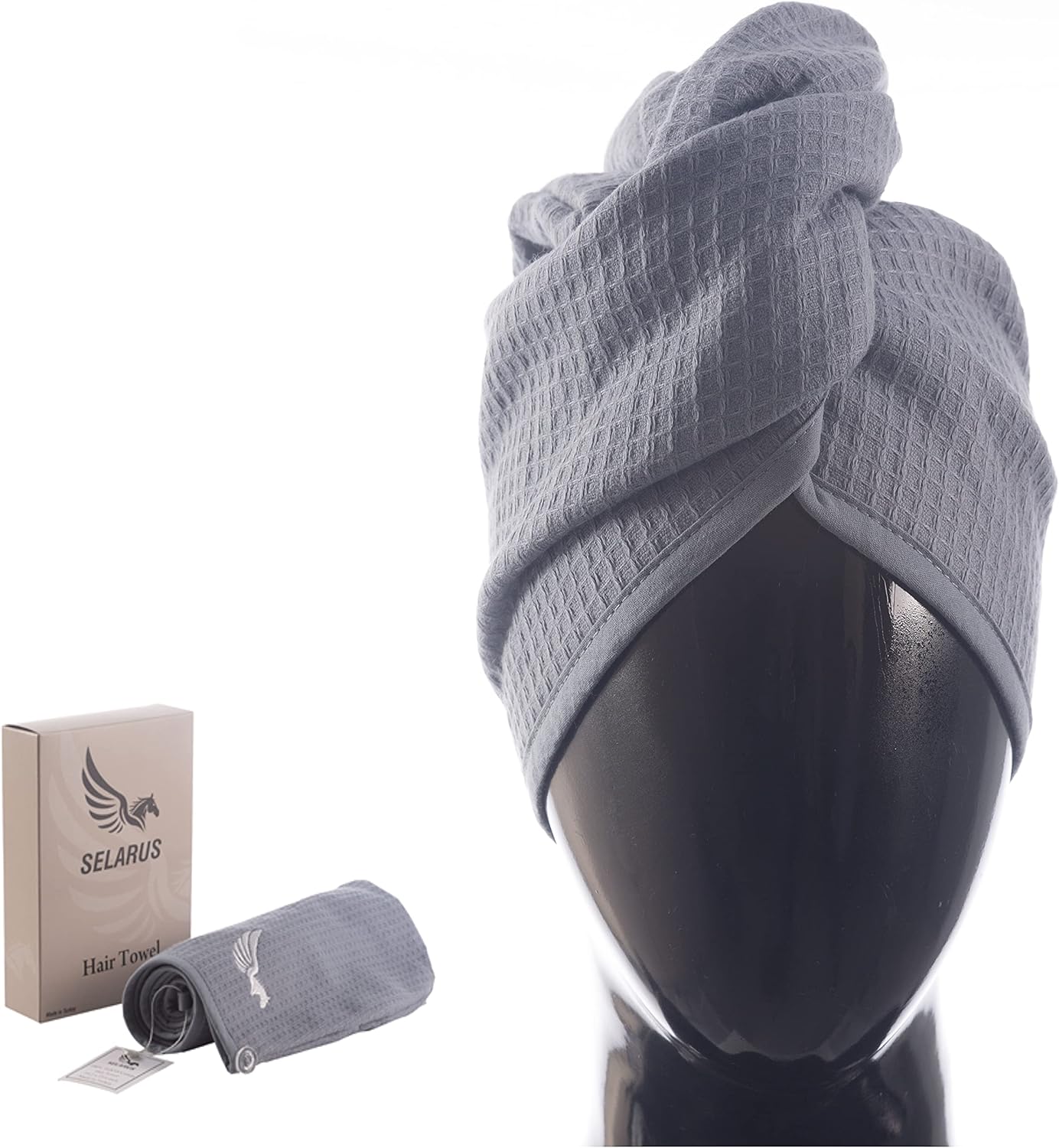 - NEW DESIGN HAIR DRYING TOWEL: Selarus hair towel wraps are made of 100% Cotton 400-GSM(Grams per Square Metre) Premium Quality weave fabric. The outer is waffle design and the inner is weaved 100% long-stable cotton which has double yarn ring spun. Our products has Oeko-Tex confidence in textiles and BSCI(business social compliance initiative) certificates. Unlike others, Selarus hair wraps for women is not made of microfiber.