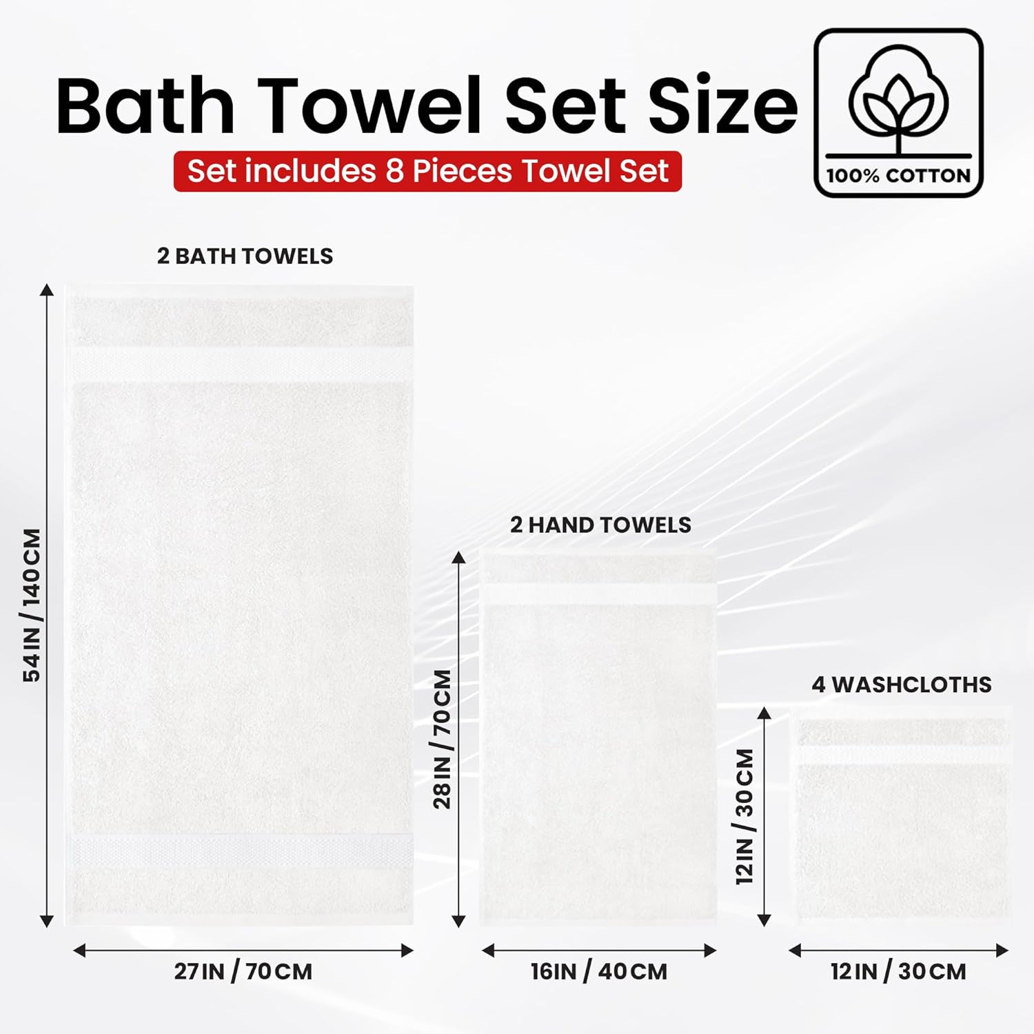 Infinitee Xclusives Luxury 100% Cotton Towel Set – 8 Piece Bathroom Towel Set (2 Bath Towels, 2 Hand Towels, 4 Washcloths) – Soft & Absorbent Towels for Bathroom (Brilliant White)
