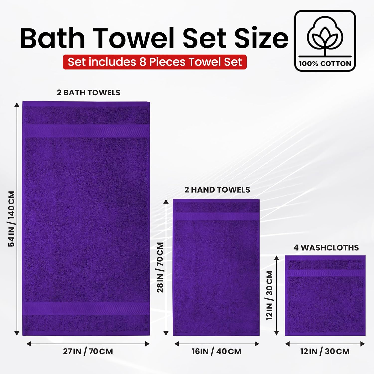 Infinitee Xclusives Luxury 100% Cotton Towel Set – 8 Piece Bathroom Towel Set (2 Bath Towels, 2 Hand Towels, 4 Washcloths) – Soft & Absorbent Towels for Bathroom (Profound Purple)