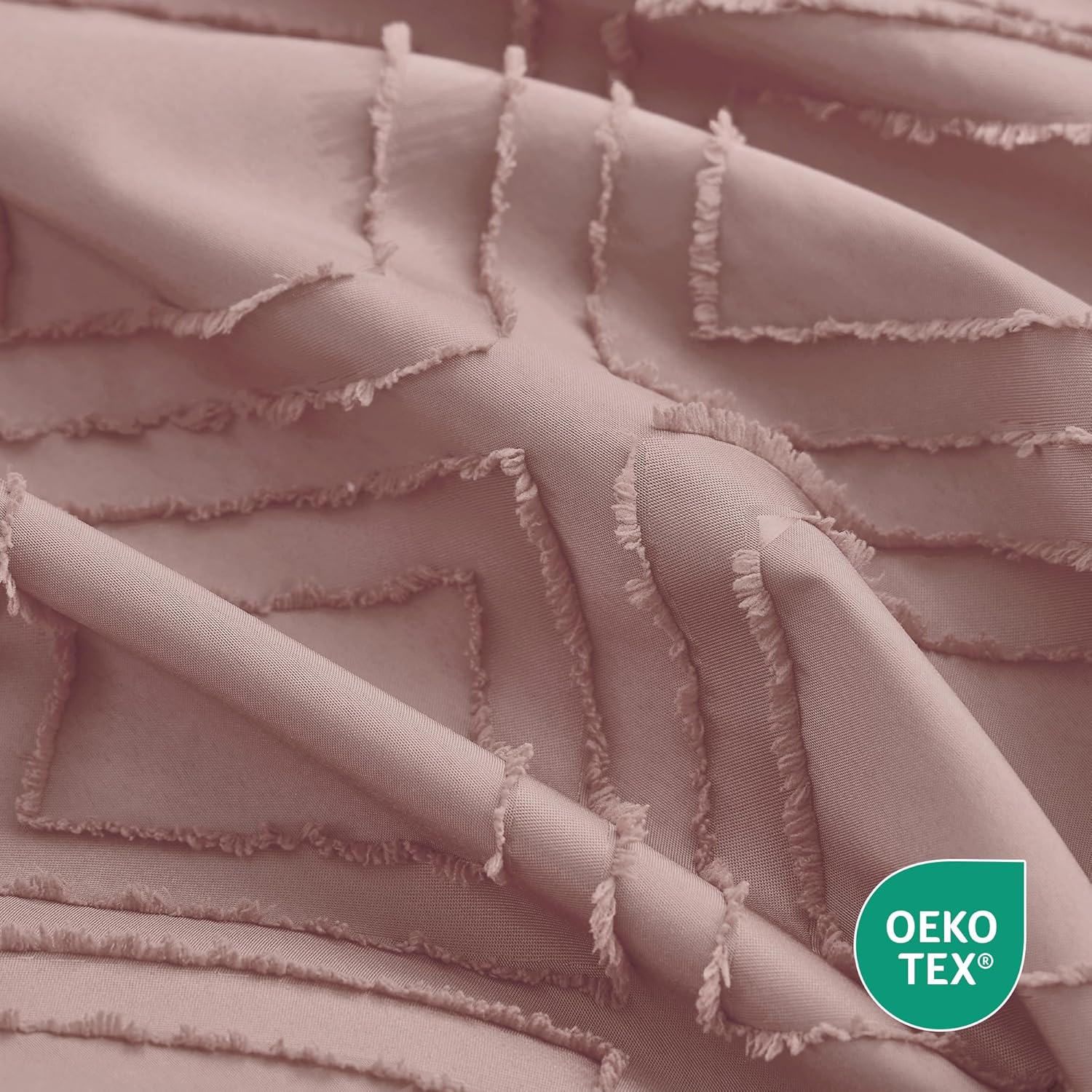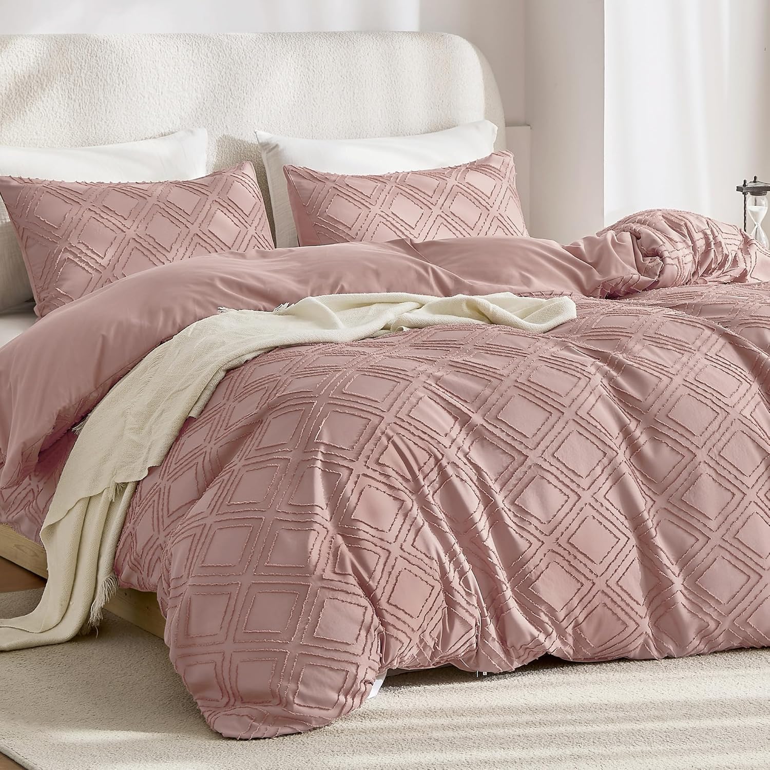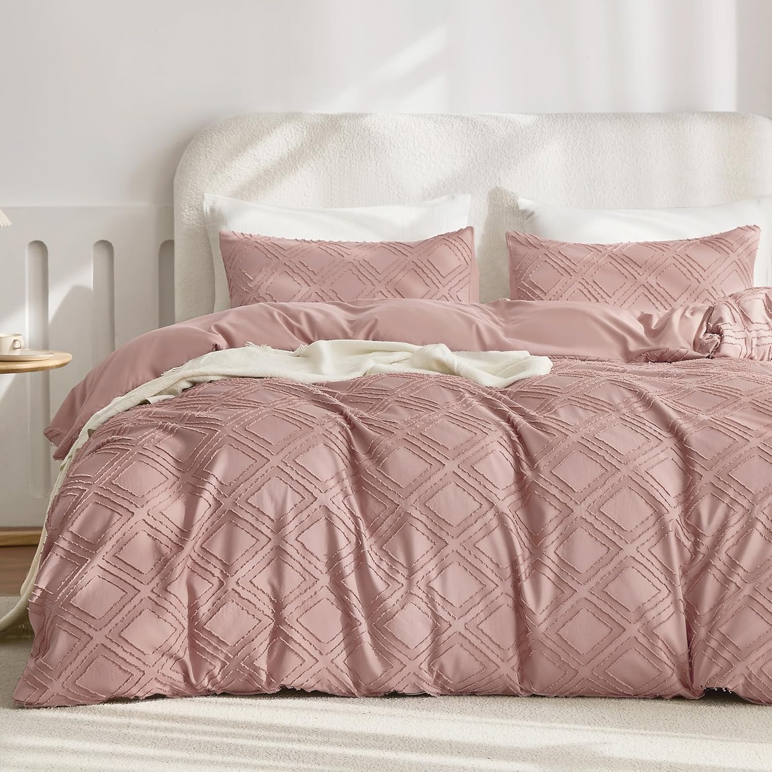 JELLYMONI Duvet Cover Queen Size Smokey Pink - 3PCS Boho Duvet Cover Set Plaid Polyester Tufted Bohemian Jacquard Knit Textured Comforter Cover 90×90in Rhombic Geometric Pattern Zipper Corner Tie