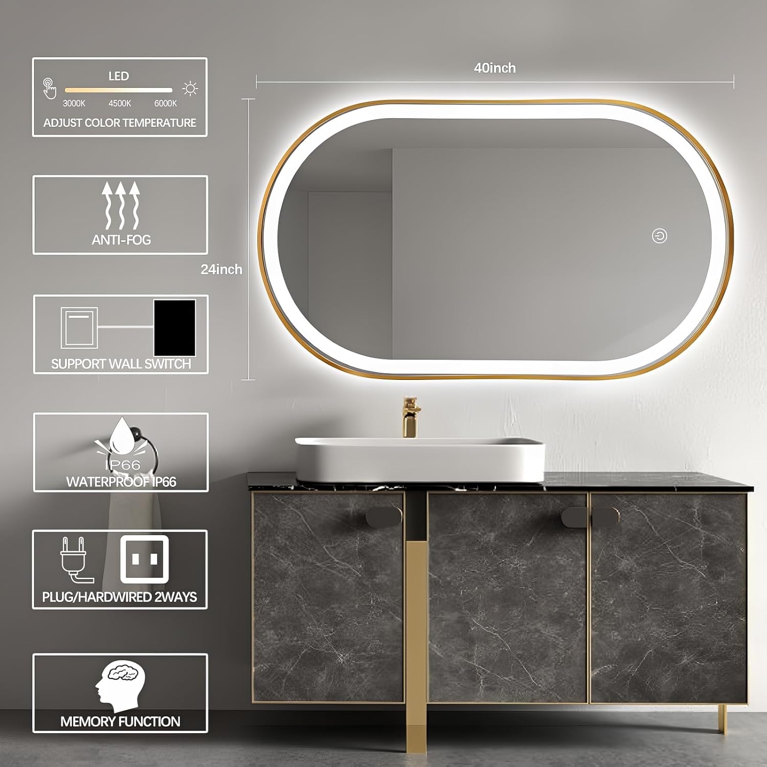 40"x24" Oval LED Bathroom Mirror with Lights, Gold Anti Fog Lighted Vanity Mirror Wall Mounted, Stepless Dimmable LED Oval Mirror, Memory, ShatterProof, Front/Backlit, Horizontal/Vertical
