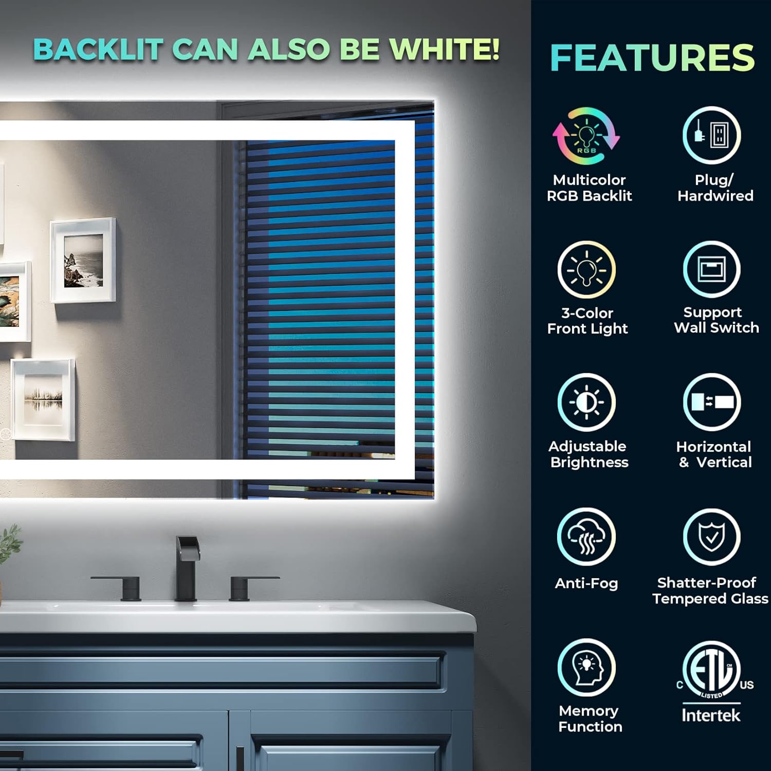 48x32 Inch RGB LED Bathroom Mirror Front Light and RGB Backlit Lighted Vanity Mirror for Bathroom Wall Mounted Dimmable Anti Fog Memory Shatter-Proof IP54 Waterproof Horizontal/Vertical