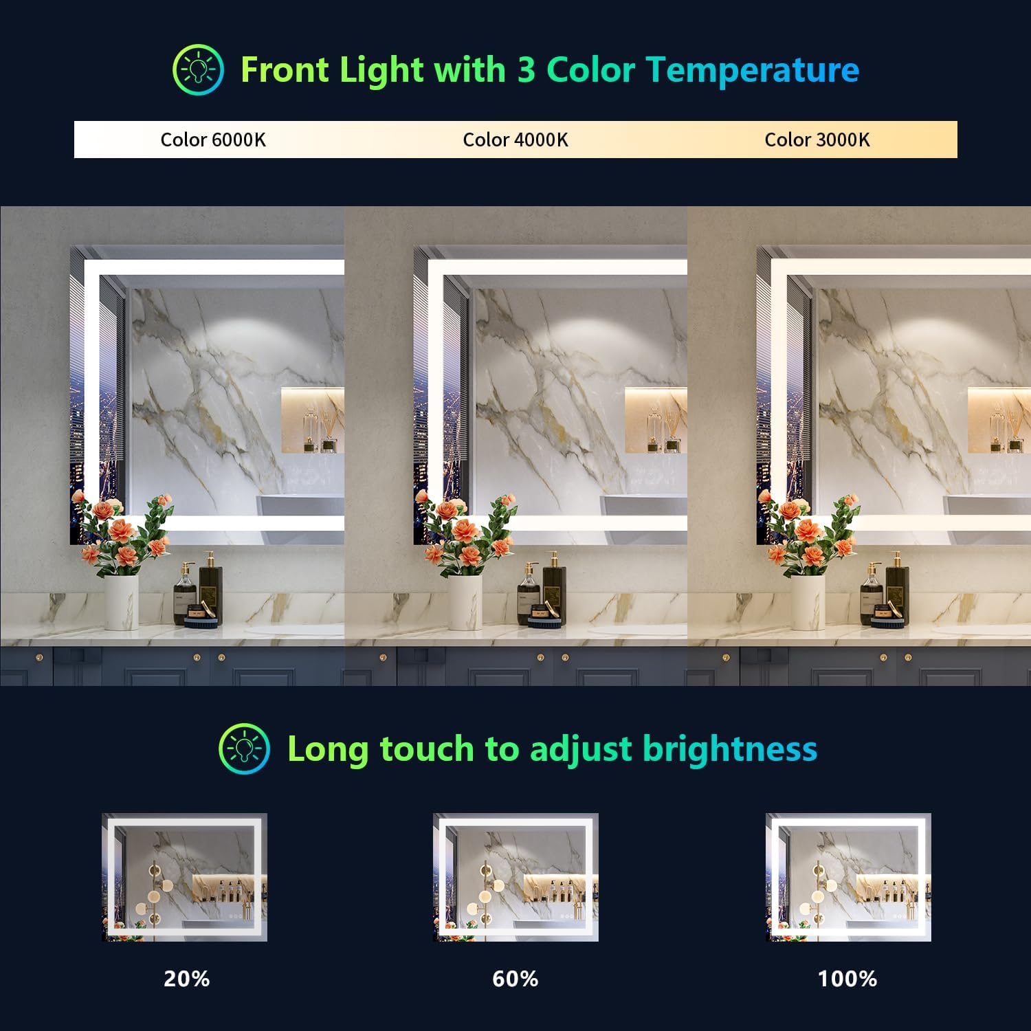 - 💎【3+8 Light Colors, Make a Difference】- This led mirror for bathroom has 3 front light modes: warm(3000K), white (4000K) and cold (6000K). RGB backlit has 8 light modes: warm / white / cold / flowing colorful / purple / red / green / blue. THE BACK LIGHT CAN BE WHITE ONLY! The muli color tone options are what makes this led vanity mirror and what makes your bathroom truly difference.