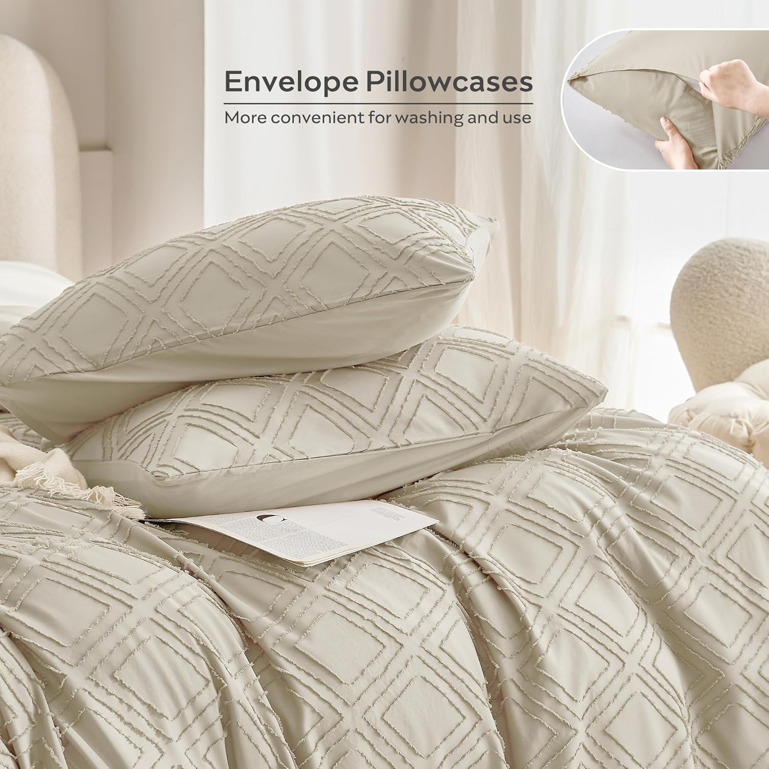 JELLYMONI Duvet Cover King Size Light Khaki - 3PCS Boho Duvet Cover Set Plaid Polyester Tufted Bohemian Jacquard Knit Textured Comforter Cover 104×90in Rhombic Geometric Pattern Zipper Corner Tie