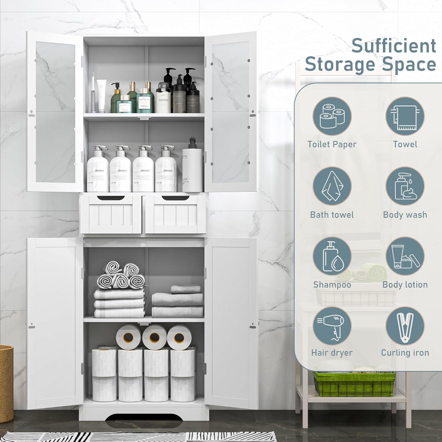 - 【Quality & Safety】Constructed from high-quality P2 MDF, our tall bathroom cabinet is built to last. It resists moisture and deformation, making it ideal for use in bathrooms or humid environments. The white bathroom cabinet is finished with an eco-friendly, odorless paint that is safe for your family. For added security, it includes an anti-tip mechanism that can be fixed to the wall, preventing accidental tipping and ensuring a safe living space.