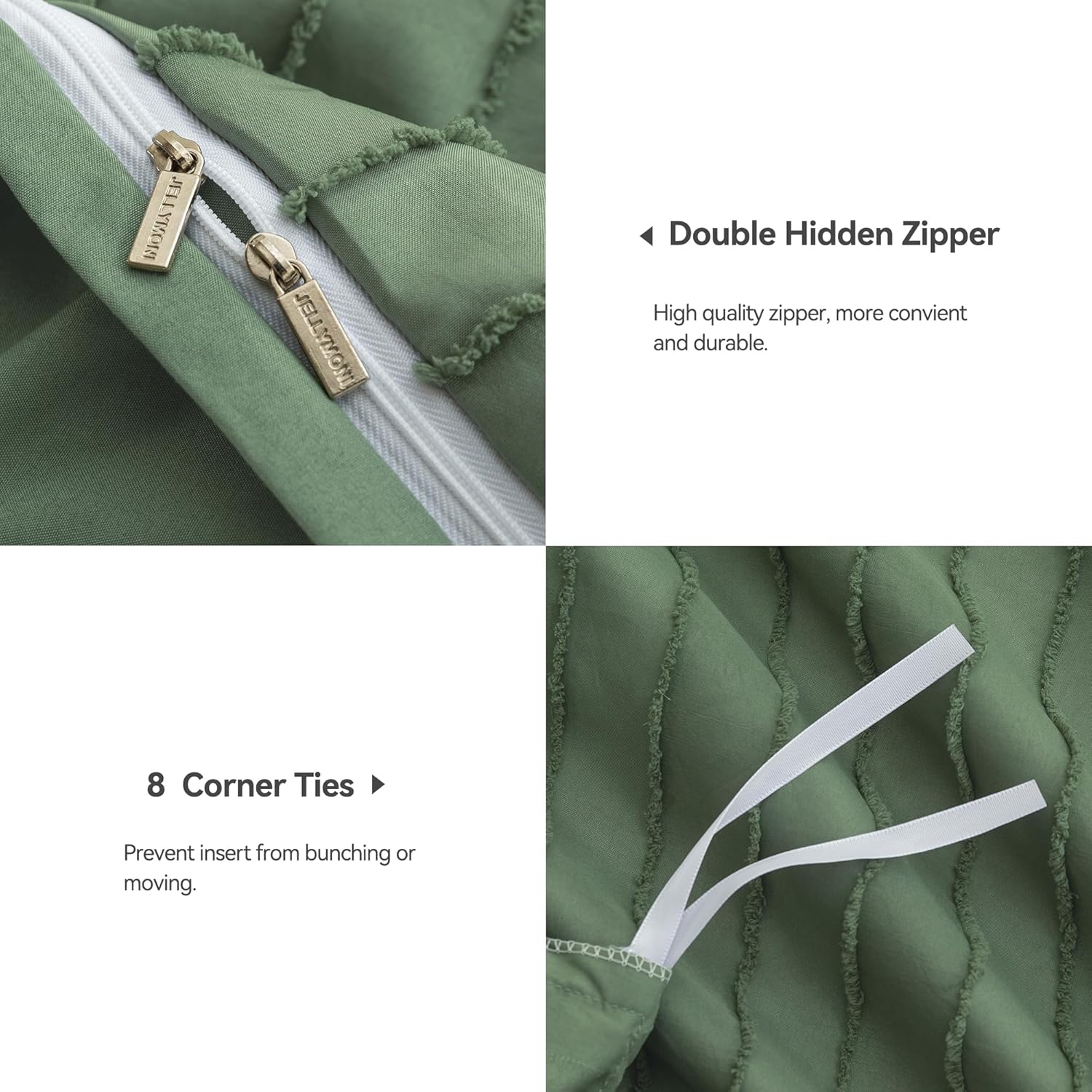 JELLYMONI Duvet Cover Full Size Green - 3PCS Boho Striped Duvet Cover Set Polyester Tufted Bohemian Textured Comforter Cover 80×90in with Corner Ties & Zipper and 2 Pillowcases