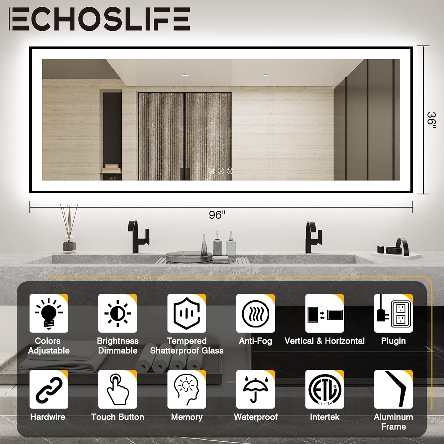 - [Space Black Aluminum Frame] Unlike other large LED bathroom mirrors, EchosLife's mirrors feature modern space black aluminum frames that create sophisticated atmospheres and add authentic touch of luxury.