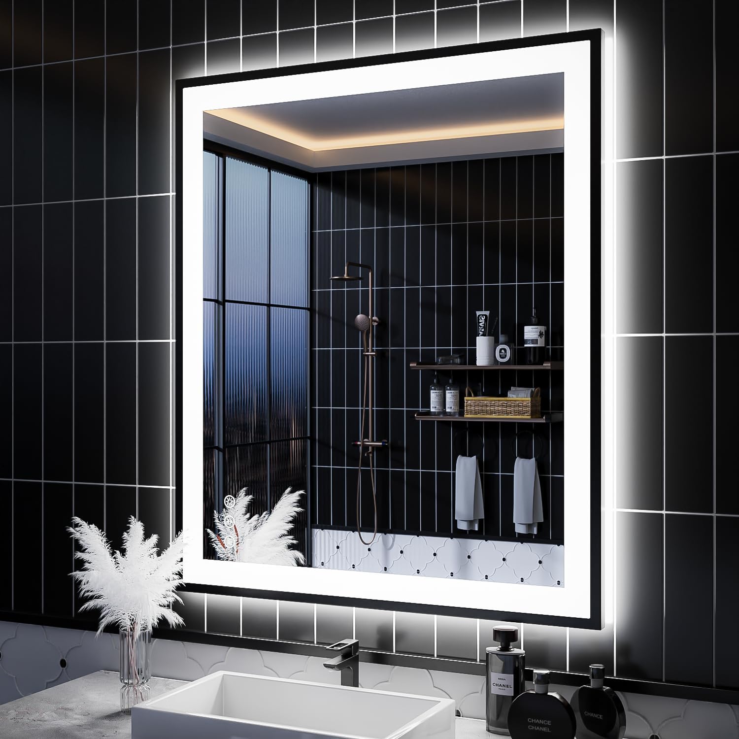 ISKM Framed LED Mirror for Bathroom 36"x28", Dimmable LED Bathroom Mirror with Lights, Anti-Fog, Front and Backlit Lighted Mirror 3-Colors, Shatterproof, Memory Function