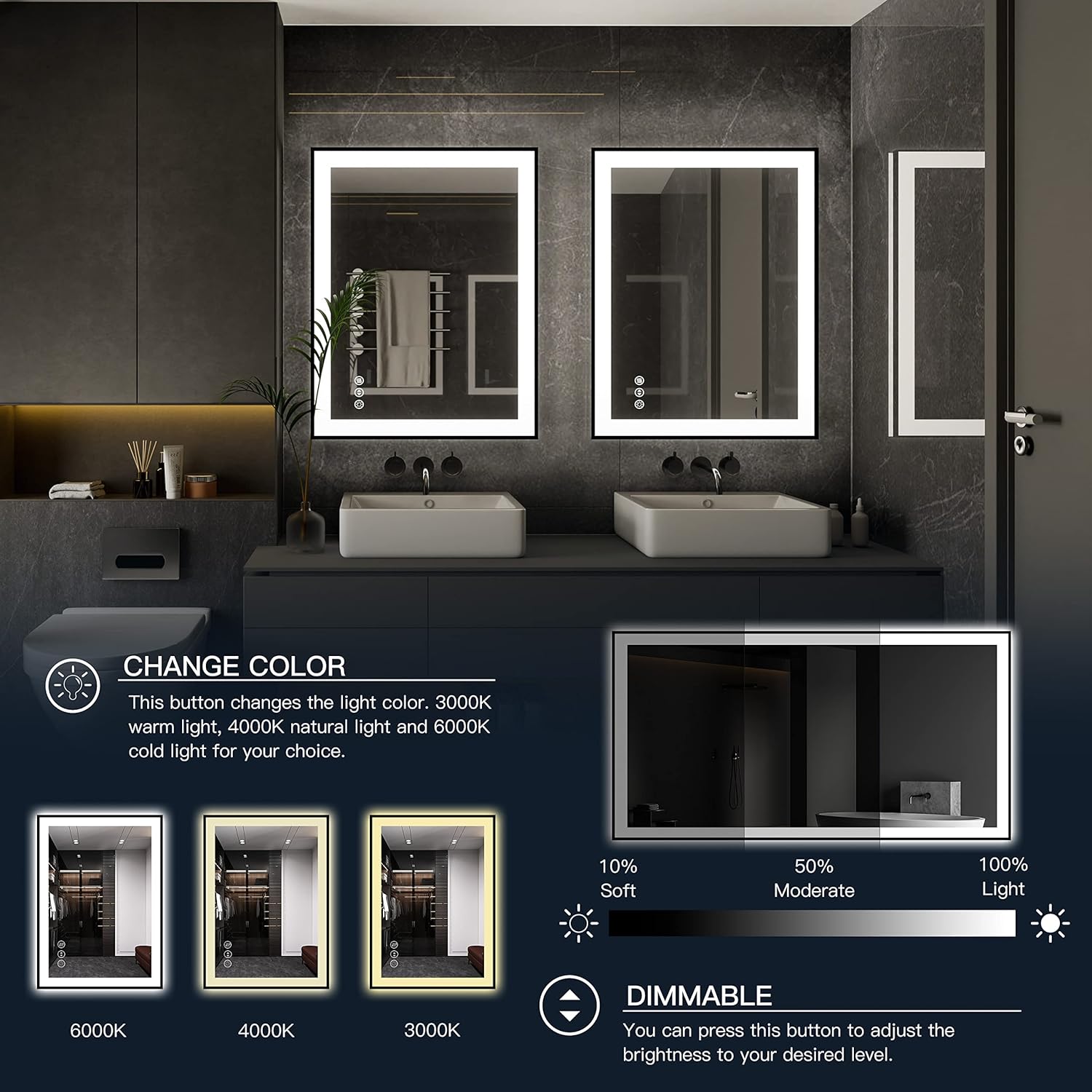 - 【Double Lights & Black Aluminum Frame】ISKM Framed LED Bathroom Mirror is more durable, elegant and modern. The front light and back light make your room brighter, making makeup, shaving and skin care more convenient. Made of high-quality aluminum alloy and thickened baking paint, the metal frame is lighter and sturdier, and better protects the mirror.
