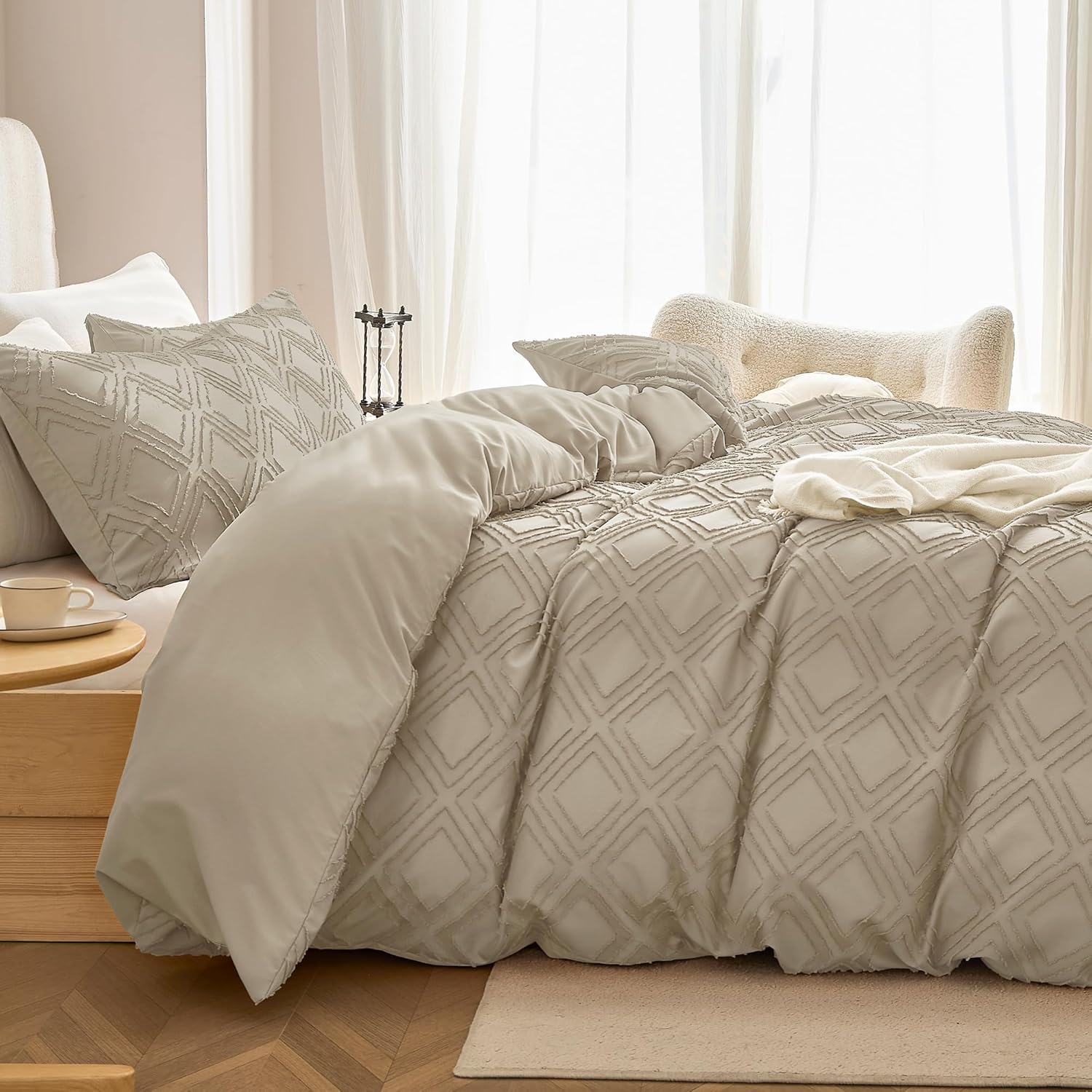 JELLYMONI Duvet Cover Full Size Khaki - 3PCS Boho Duvet Cover Set Plaid Polyester Tufted Bohemian Jacquard Knit Textured Comforter Cover 80×90in Rhombic Geometric Pattern Corner Ties & Zipper
