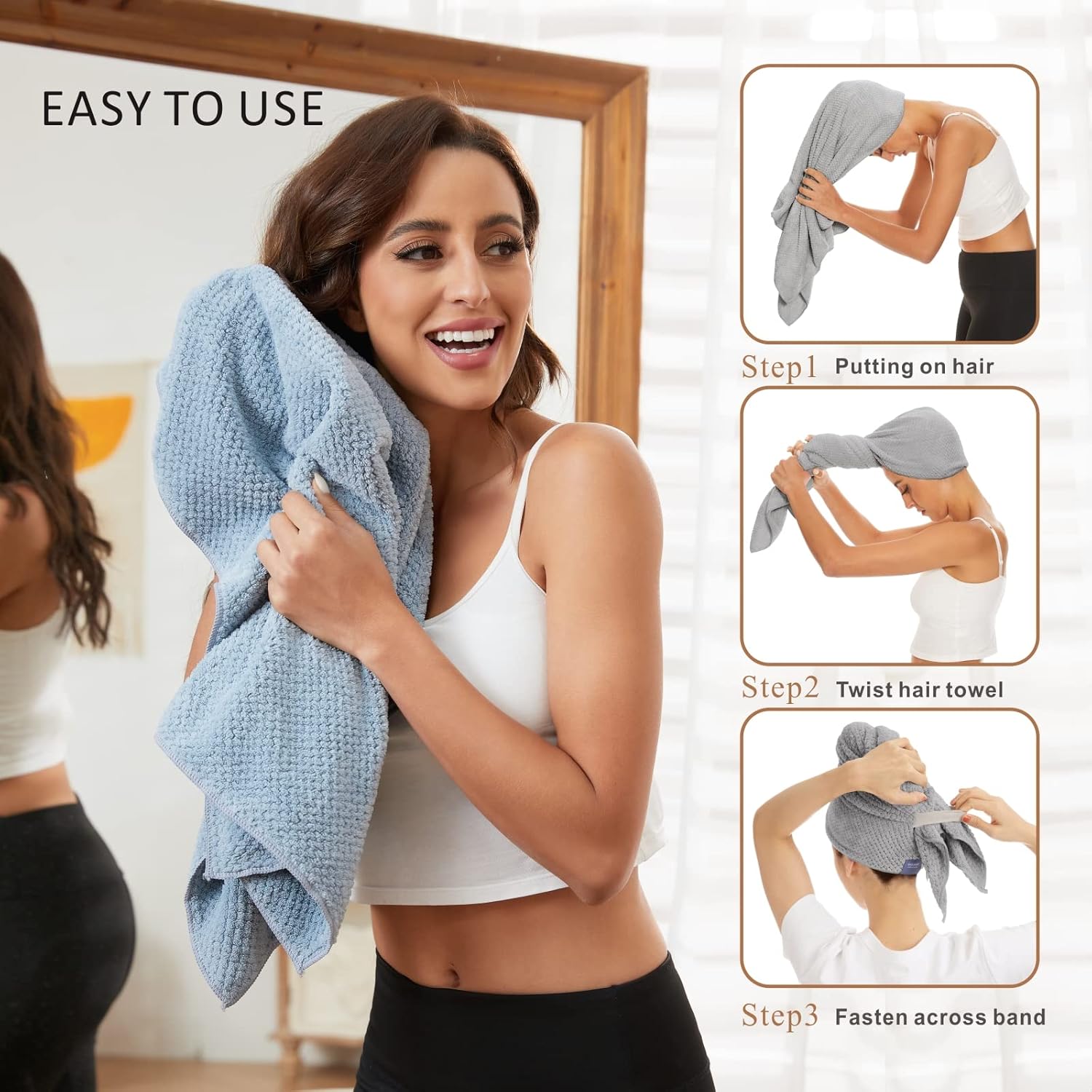 - EASY TO USE , NEVER FALLS OFF - This Lightweight and durable ultra soft hair towel wraps, we have a strong elastic loop on the back design that is easy to use, Simply wrap, twist, tuck keep the hair turban towel secure on your head - it won't fall off! Provide greater convenience for hands-free multitasking, mornings and nights.