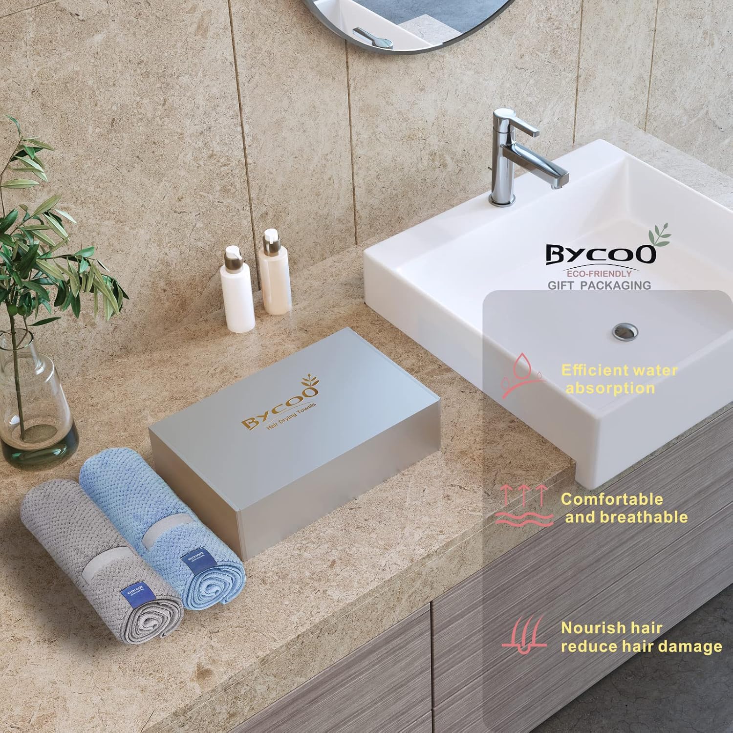 - FAMILY FRIENDLY - Our microfiber materials have a longer life, less pollution, less consumption, and less waste.Suitable for family travel, gym, yoga, camping, spa. Wrap your little ones with a BYCOO towel after a bath, shower, or beach time. Give our microfiber hair towels a gift for your beloved ones, for your wife, mom, child, friends, yourself.