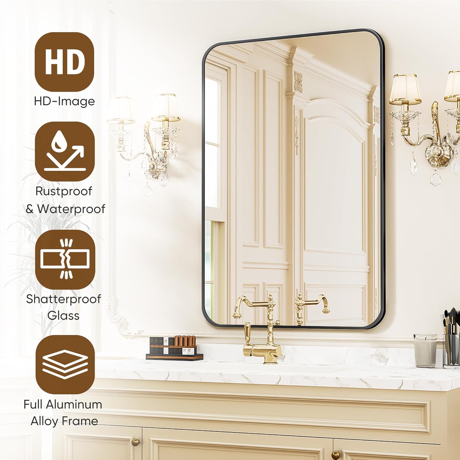 Antok Bathroom Mirror, 36"x24" Wall Mirror, Decorative Mirrors Vanity Mirror Aluminum Alloy Frame Contemporary Rectangular Hanging Mirror for Living Room Bathroom Entryway,Black,Round Corner
