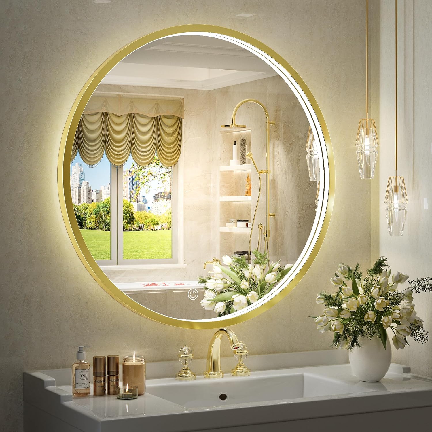 24" Round LED Bathroom Mirror, Dimmable Anti-Fog Vanity Mirror with Touch Control, 6000K Natural Light, Gold Metal Frame, Wall Mounted for Makeup Shaving (IP54, 90+ CRI)