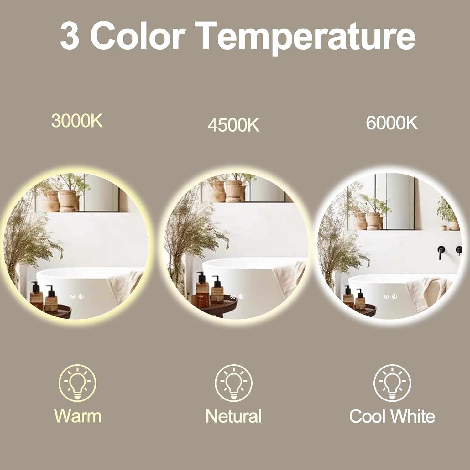 - 🌟【Smart Memory】The smart memory function will record the lighting setting, keep the previous status after turning off and on, provides great convenience. *If using OUTLET, touch button on mirror, it can only record the light (Normal to Brightest) but not three color temperatures (Warm/Neutral/Cold). If using HARDWIRE, controlled by switch, it can records both light and color temperatures.*