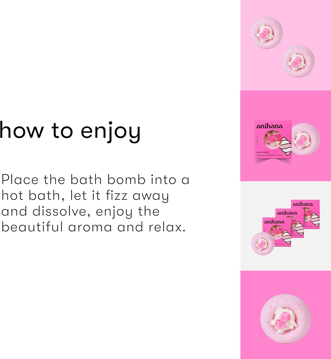 ANIHANA Bath Bombs with Coconut Oil, Paraben Free, Hand-Crafted Luxury Fizzers, Refreshing Raspberry Marshmellow Scent, 6.3 oz Each, 3 Pack