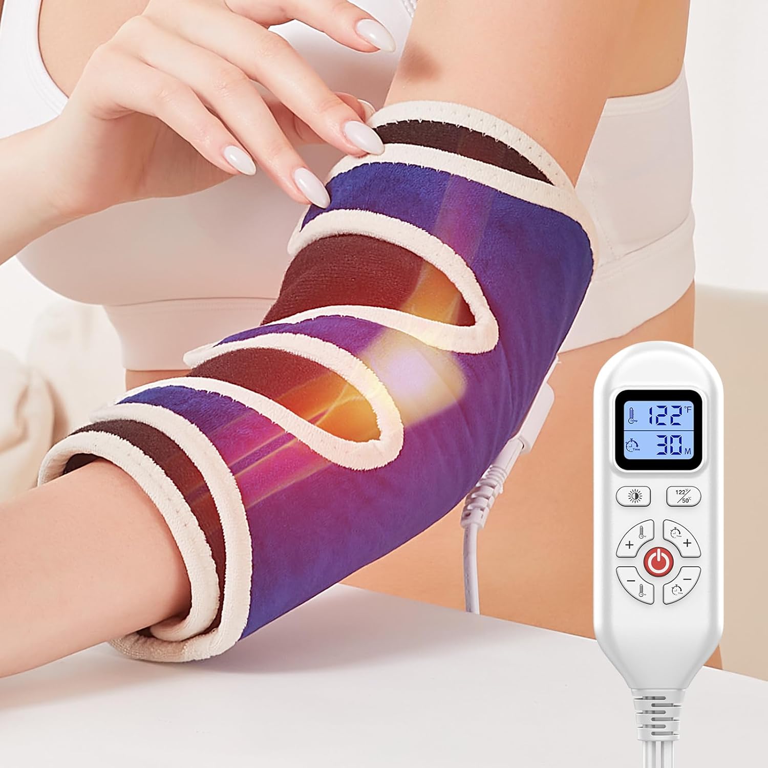 - Flexible Size & Backlight Setting: With 3 large magic tapes to adjust the size, the heat pad for elbow pain can be worn on left or right arm for both men and women. Ergonomic design allows you to wear and take off easily. A digital LED controller with clear time and temperature display makes the heating pad for elbow pain relief easier to adjust the heating time and temperature even at night.