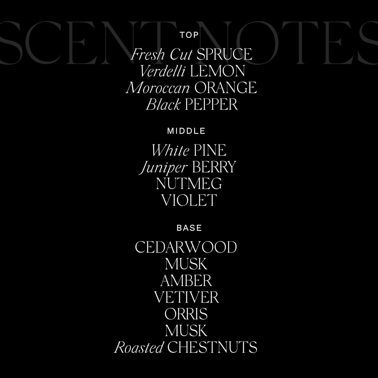 - Wonder of the Forest: Freshly-cut branches of evergreen trees mingle with bursts of grown-up citrus top notes for a refined twist; an undercurrent of a warm woods accord imparts an ambery softness