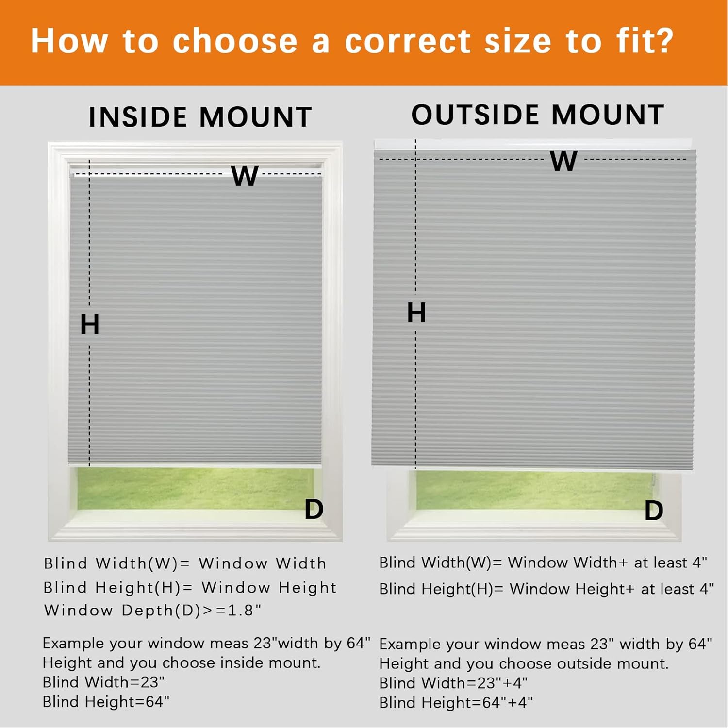 - 【How to choose a correct size to fit? Example your window meas 23" width by 72" length.】INSIDE MOUNT: window width is blind width, window height is blind height. Blind Width=23"; Blind Height=72". OUTSIDE MOUNT: Plus at least 4" is blind width, plus at least 4" is blind height. Blind Width=23"+4"; Blind Height=72"+4".【Pls Note】Fabric width will be 0.16" shorter than the size of the shade.