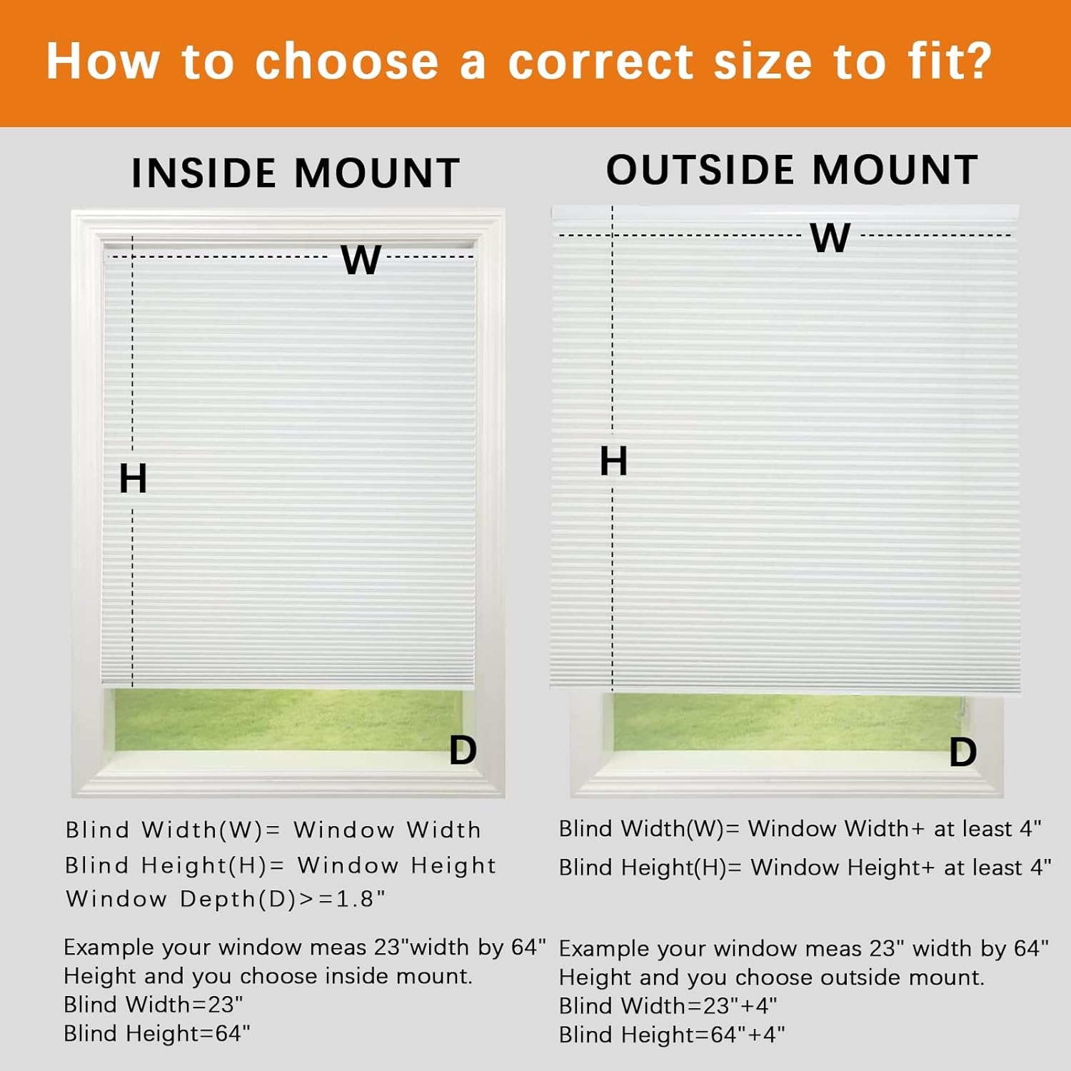 - 【How to choose a correct size to fit? Example your window meas 23" width by 72" length.】INSIDE MOUNT: window width is blind width, window height is blind height. Blind Width=23"; Blind Height=72". OUTSIDE MOUNT: Plus at least 4" is blind width, plus at least 4" is blind height. Blind Width=23"+4"; Blind Height=72"+4".【Pls Note】Fabric width will be 0.16" shorter than the size of the shade.