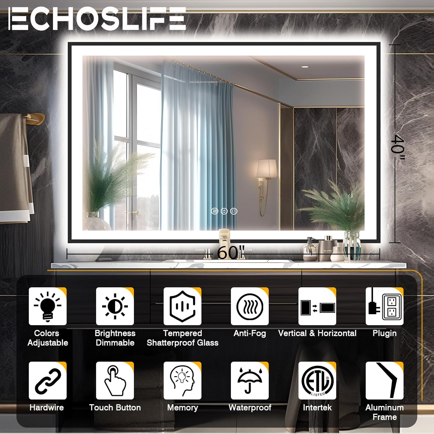 - [Space Black Aluminum Frame] Unlike other large LED bathroom mirrors, EchosLife's mirrors feature modern space black aluminum frames that create sophisticated atmospheres and add authentic touch of luxury.