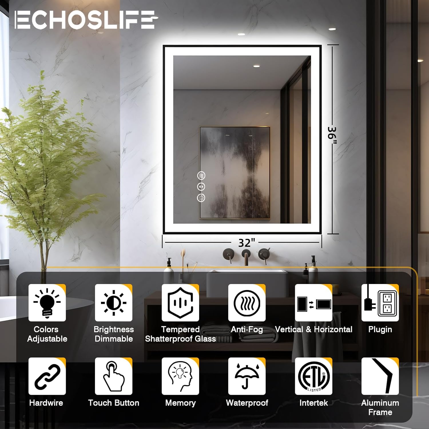 - [Ease of Assembly] EchosLife's lighted bathroom mirror features excellent mounting systems with typical "ledge" design that will never dislodge, making installation a breeze.