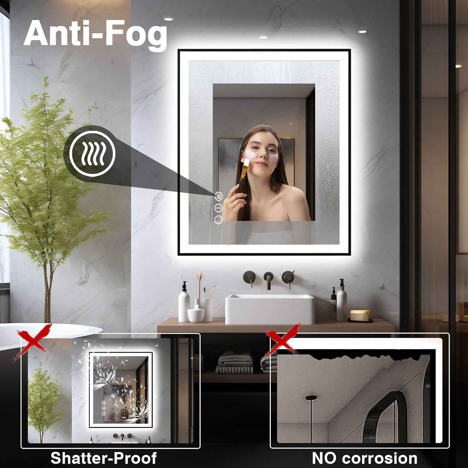 32x36 LED Bathroom Mirror - Black Border (Front and Backlit), Anti-Fog Vanity Mirror with Lights,Stepless Dimmable Illuminated Mirror,3 Colors Smart Mirror(Horizontal/Vertical)