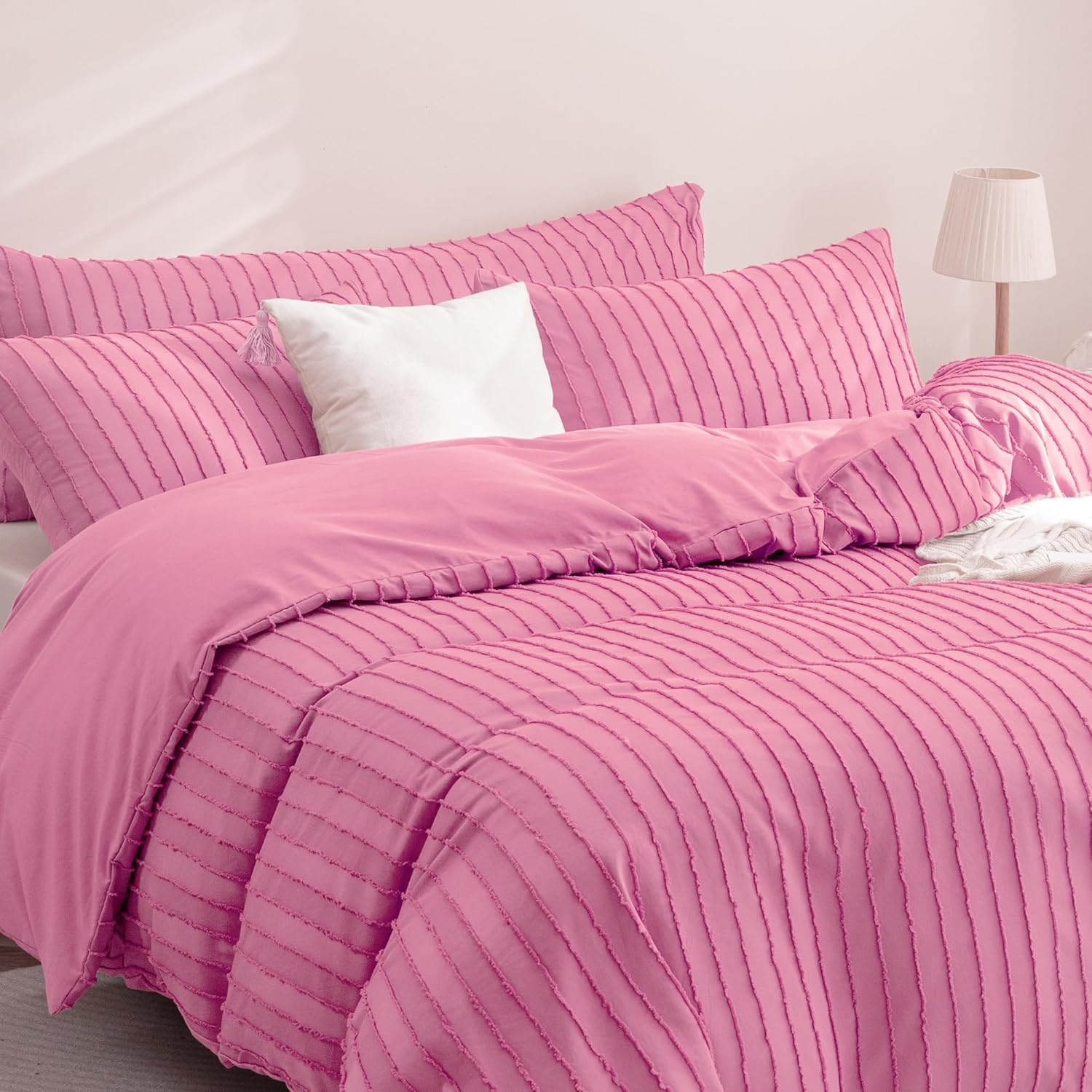 JELLYMONI Duvet Cover King Size Bright Pink - 3PCS Boho Striped Duvet Cover Set Polyester Tufted Bohemian Textured Comforter Cover with Corner Ties & Zipper Closure