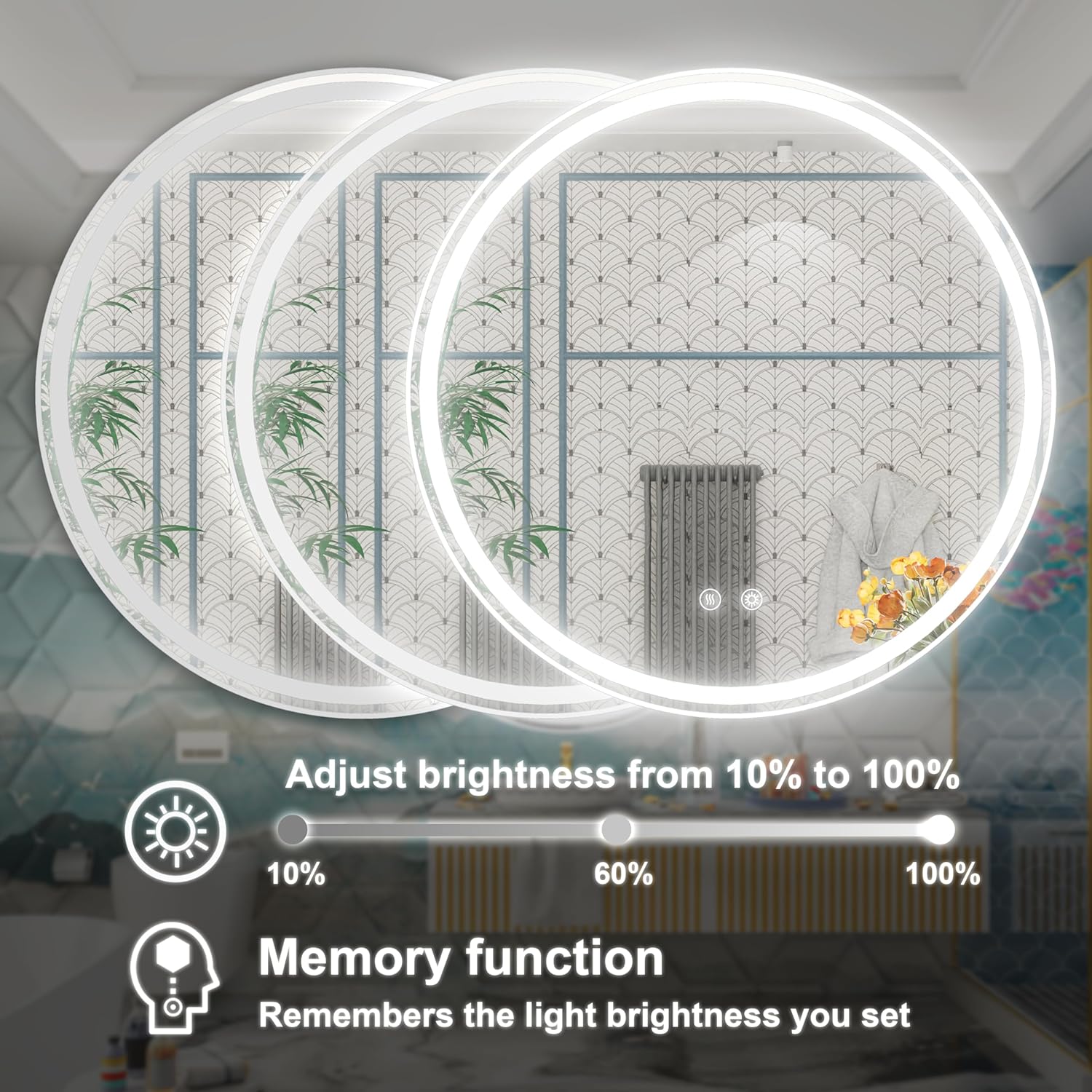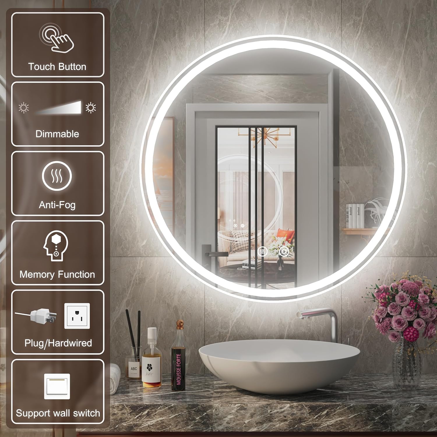 - [ Adjustable Brightness ] Infinite dimming touch control. The 6000K daylight LED ensures clear, natural lighting for makeup, shaving, or ambient mood settings