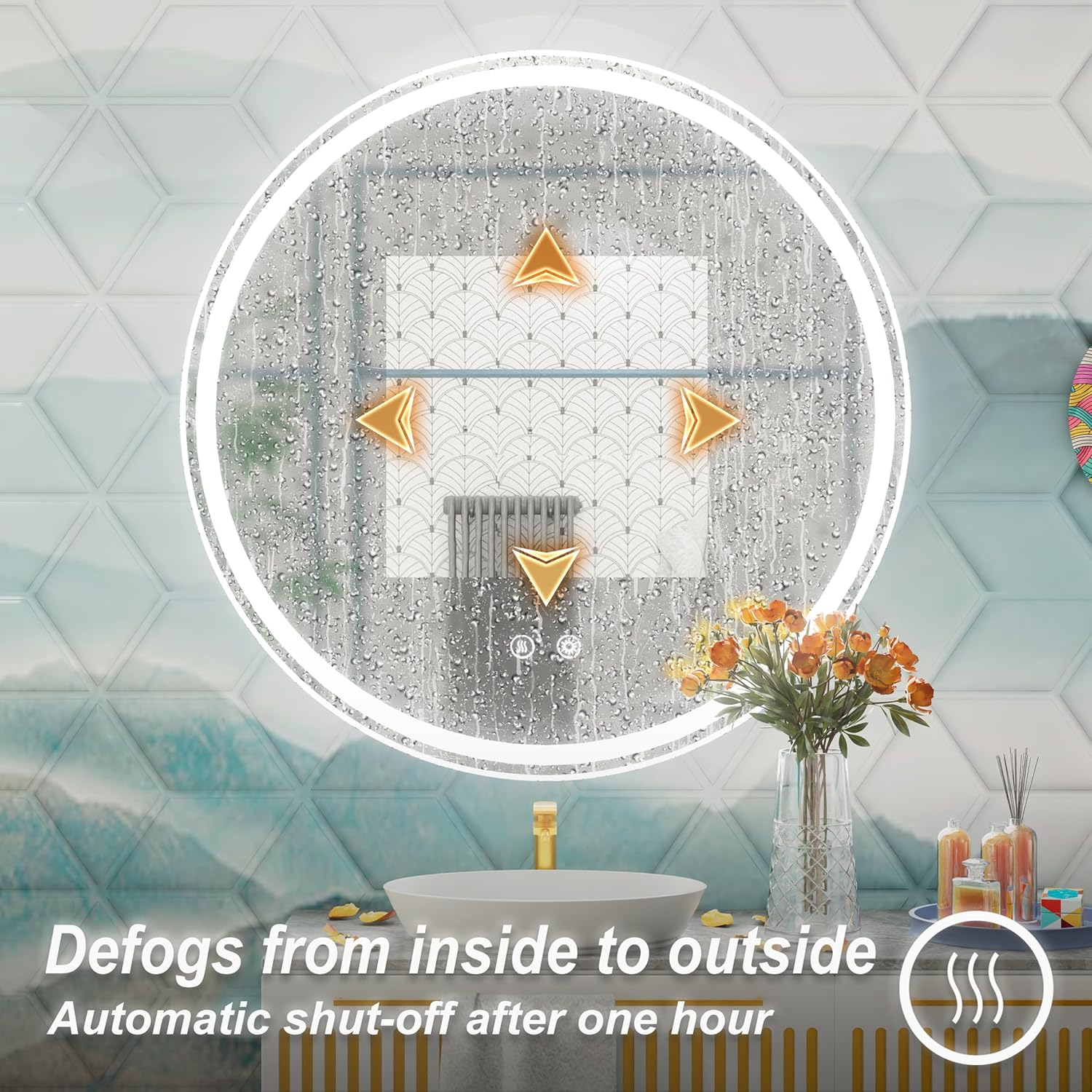 - [ Fog-Free Clarity ] Say GoodBye to Foggy Mirrors! JSneijder round led bathroom mirror has built-in defogger, ensures a clear reflection even after a hot shower, automatic shut-off after one hour,enhancing your daily routine without compromising visibility