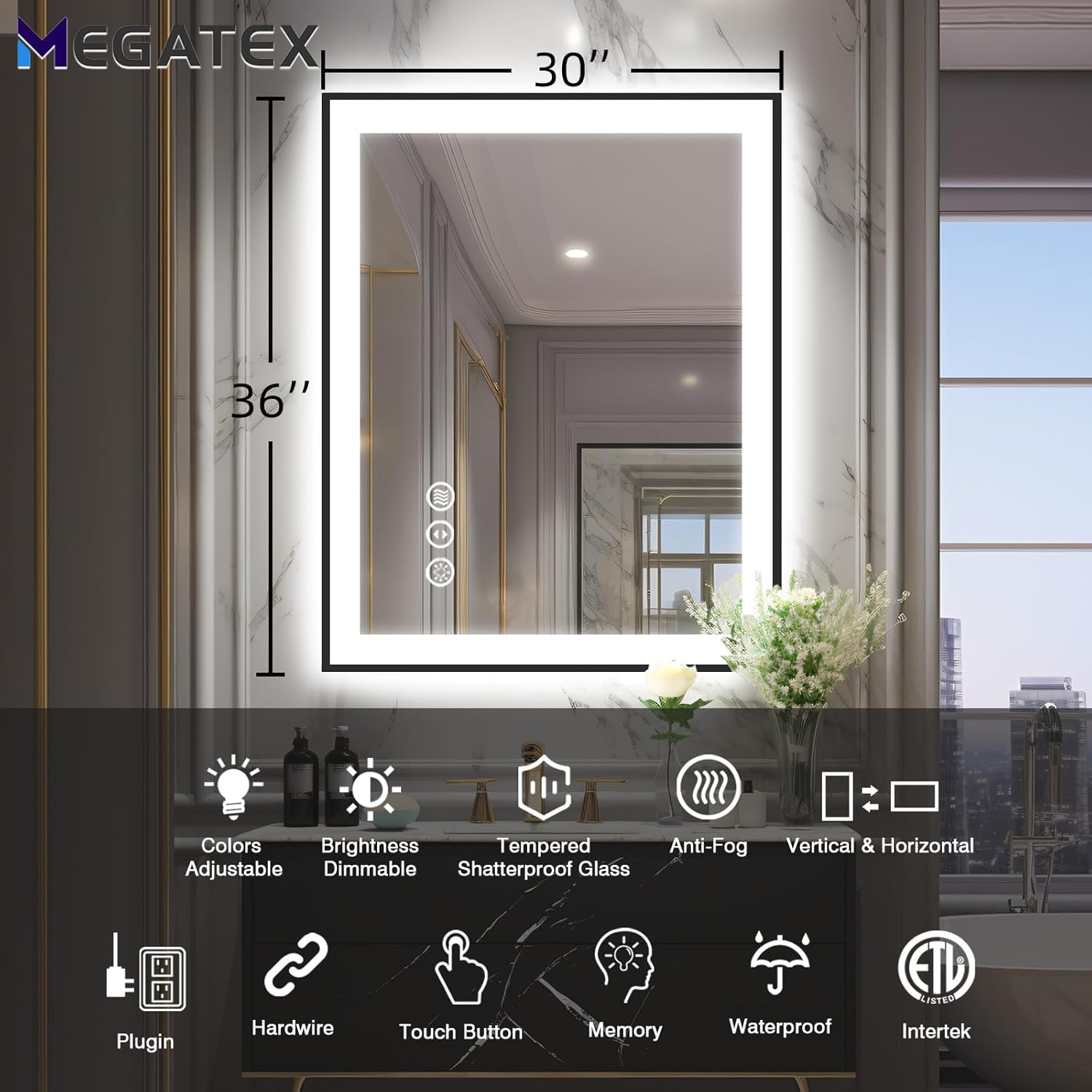 30x36 Lighted Mirrors for Bathroom Wall, Modern Rectangle Matte Black Mirror, Tempered Glass,Double Lights, 3 Colors Dimmable Temperature, IP54 Enhanced Anti-Fog, Memory (Horizontal/Vertical)