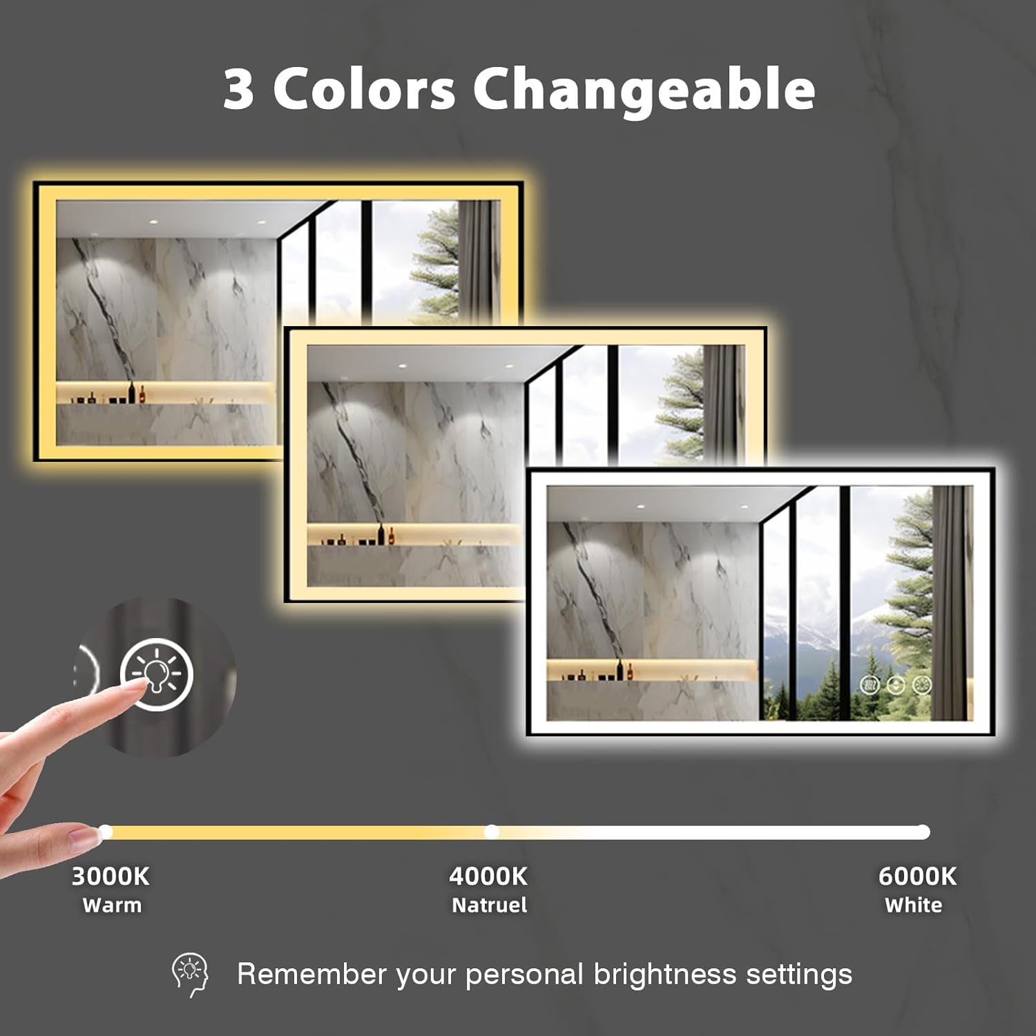 40x24 LED Bathroom Mirror for Wall, Black (Metal, Aluminum) Framed, Front Light and Backlit, 3 Colors and Dimmable Vanity Mirror, Anti-Fog, Shatter-Proof, Memory (Horizontal/Vertical)