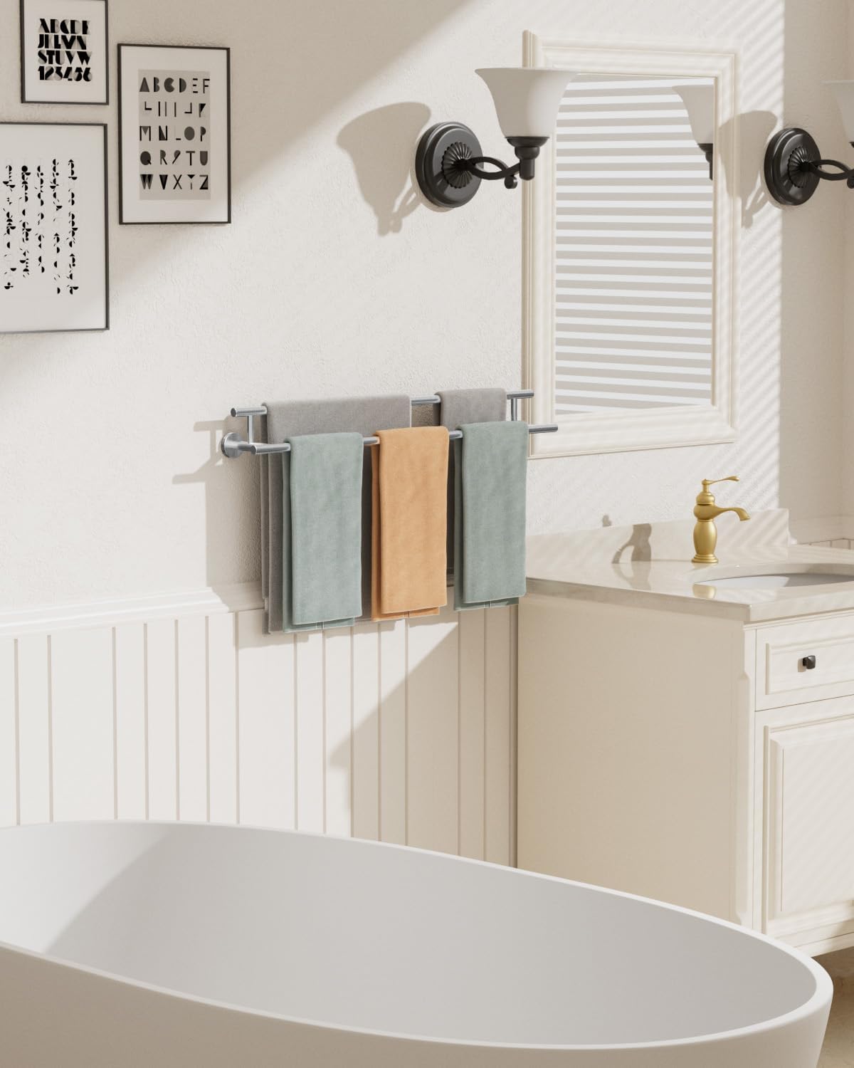 - 【Simple and Practical Design】This towel rack made of full round tube, generous and beautiful look, and unique up and down double bars design, perfect curvature to ensure that the towel can be easily hung on it, but also ensure the overall aesthetic and practical