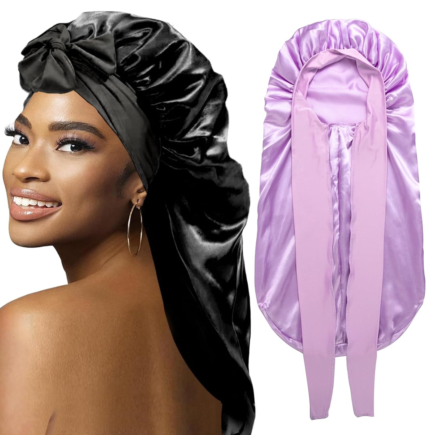 2Pcs Bonnets for Black Women Braid Bonnet, Large Long Satin Bonnet for Braids, Silk Bonnet with Stretchy Tie Band Sleep Cap Hair (2Pcs-Black&Purple)