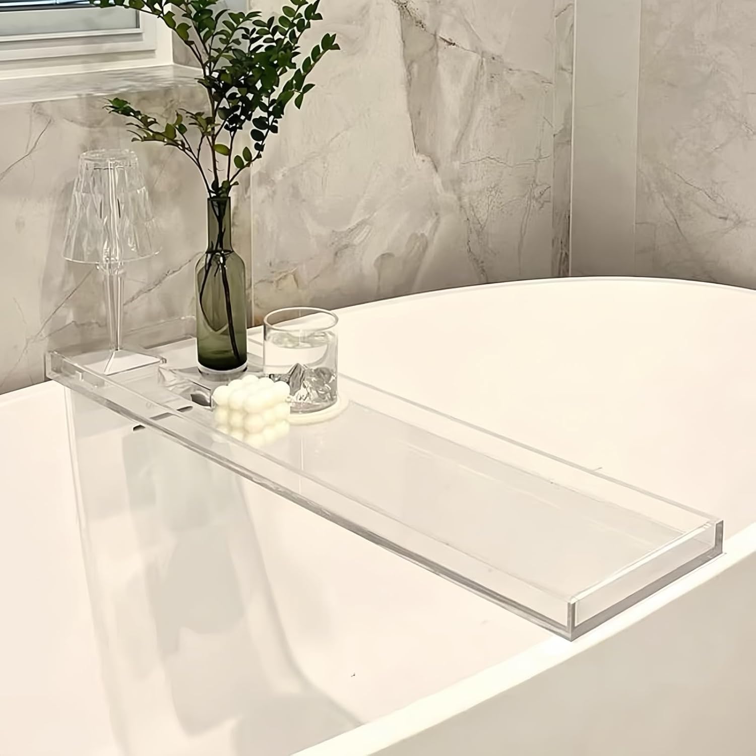 - [Function] You can use this 32.28in clear bath caddy to can make your own bathtub area and put anything you like anywhere; Acrylic material with waterproof, easy to clean. It can be cleaned with water or a soft cloth instead of a sharp cleaning tool. Enjoy the time in the bath with a book or a drink.