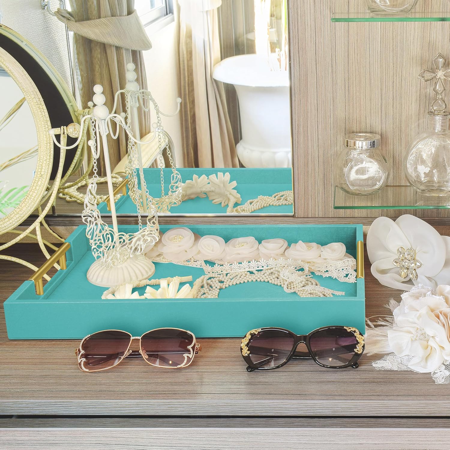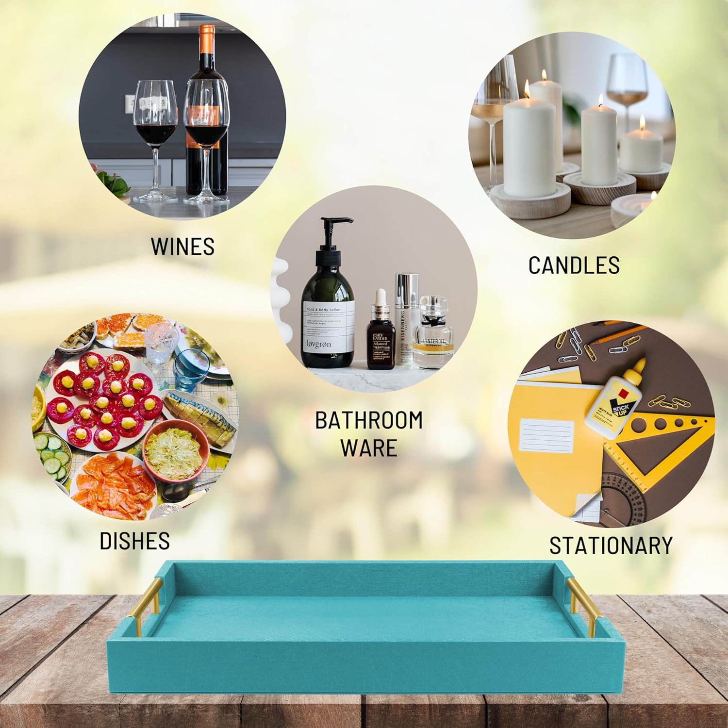 17" x 12" Wood Serving Tray with Gold Polished Metal Handles, Home Decorative Wooden Rectangle Ottoman Leather Decor Platter Bathroom Vanity Tray for All Occasions Blue