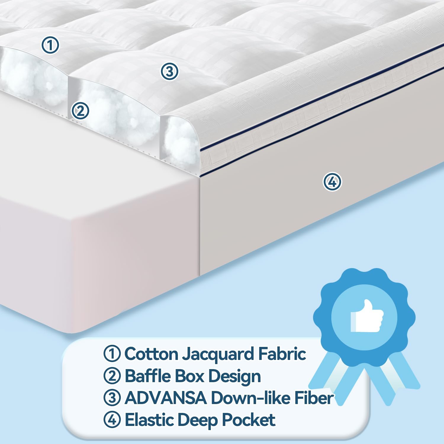 - 【Ultra Thick Filling】: The pillow top mattress topper is filled with 1300gsm down alternative fiber, making it thicker and fluffy, allowing you to immerse yourself in the ultimate comfort and effective support. We have added ADVANSA filling materials to help reduce environmental impact and improve product sustainability. This innovative blend filling provides better fluffiness and support, freeing you from restless sleep