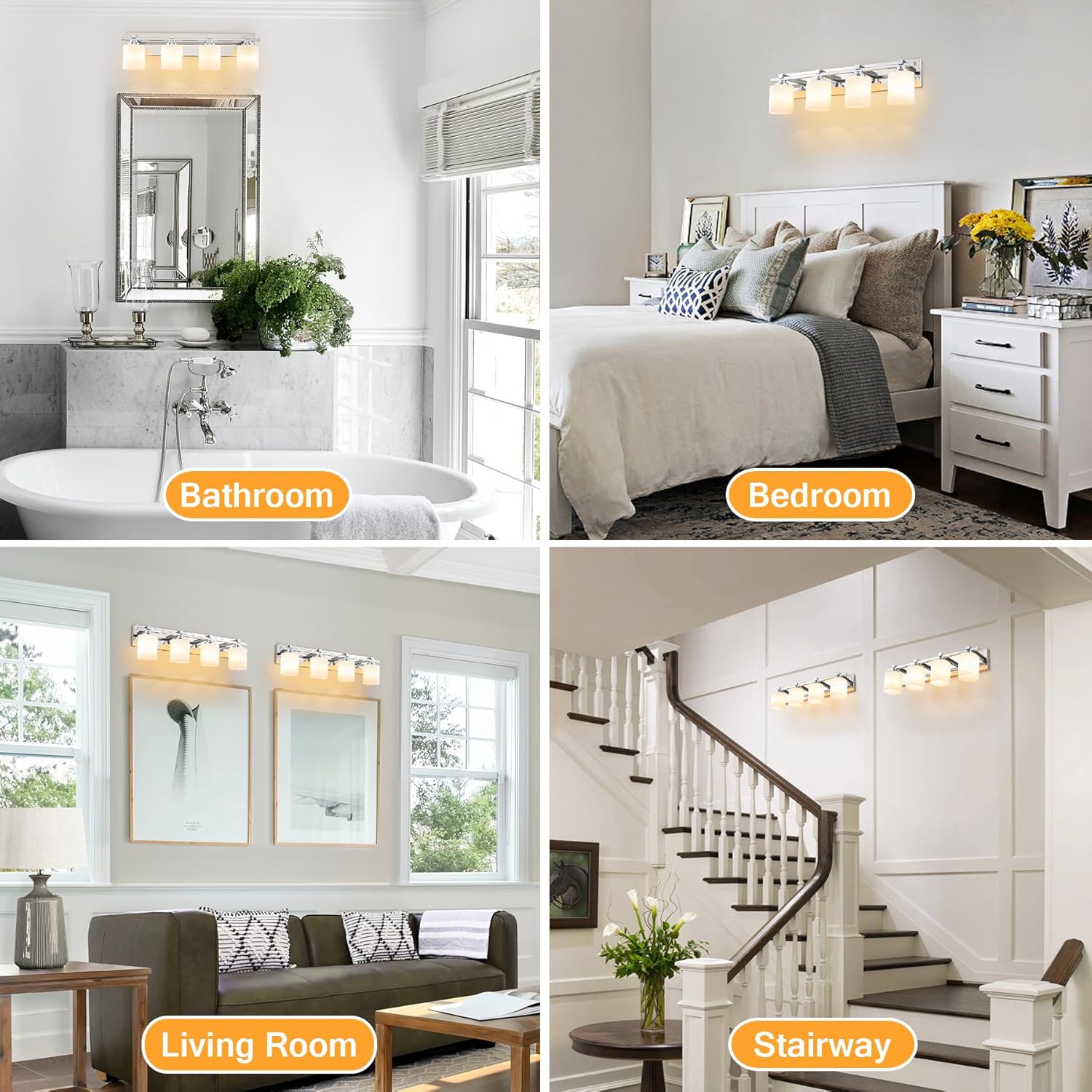 4 Light Modern Bathroom Light Fixtures Over Mirror, Chrome Vanity Lights for Bathroom Wall Sconces with Milky White Glass Shades, E26 Socket (Bulbs Not Included)